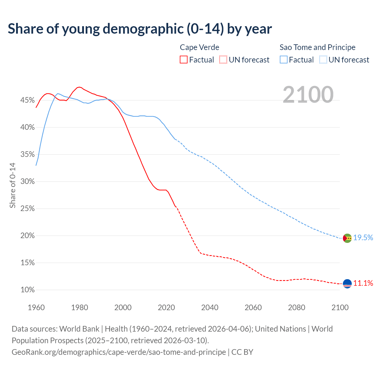 - The share of young demographic (0-15 years old) in Cape Verde is 25.5% vs 37.8% in Sao Tome and Principe.