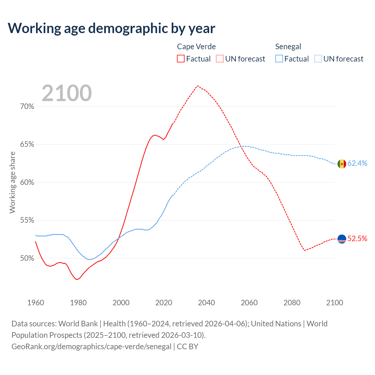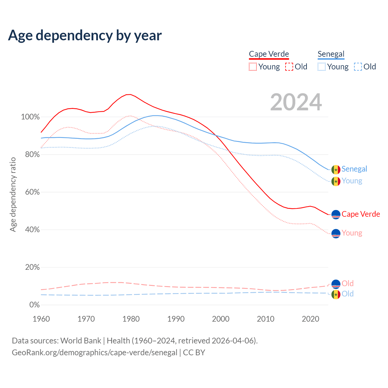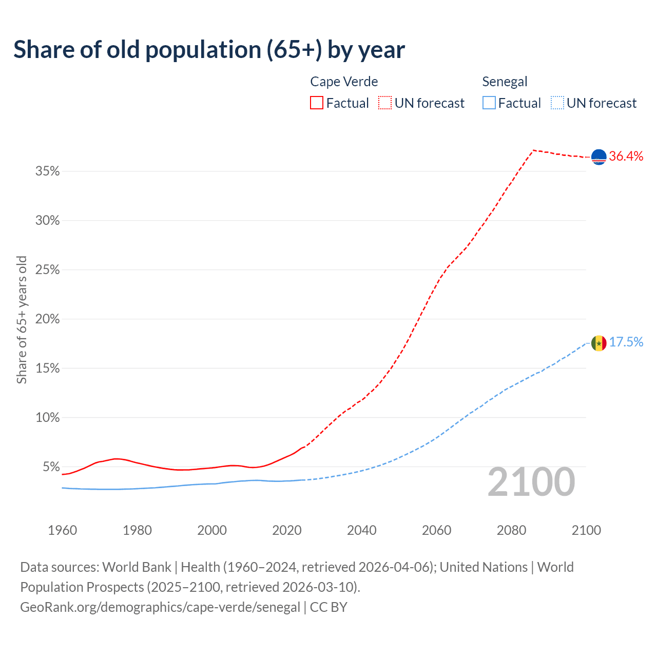 - The share of old-age demographic (65+) in Cape Verde is 6.86% vs 3.62% in Senegal.