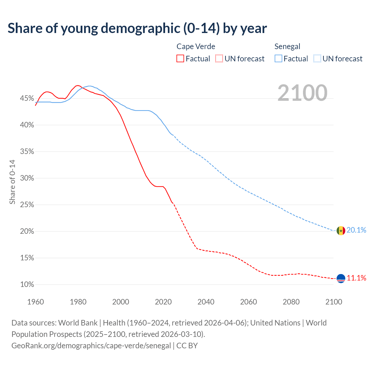 - The share of young demographic (0-15 years old) in Cape Verde is 25.5% vs 38.2% in Senegal.
