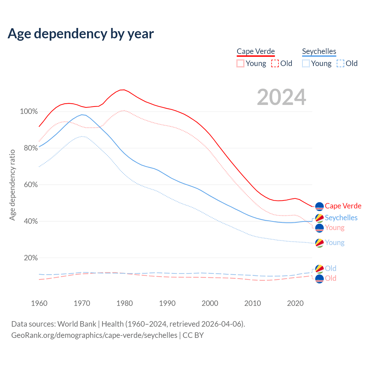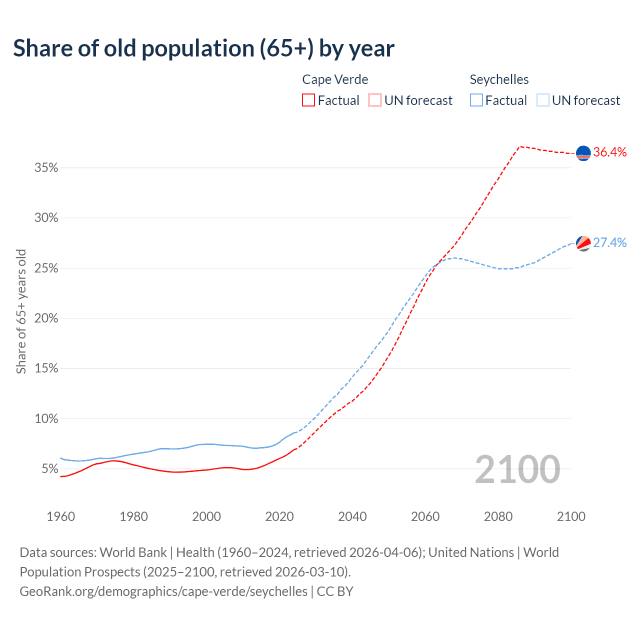 - The share of old-age demographic (65+) in Cape Verde is 6.86% vs 8.54% in the Seychelles.
