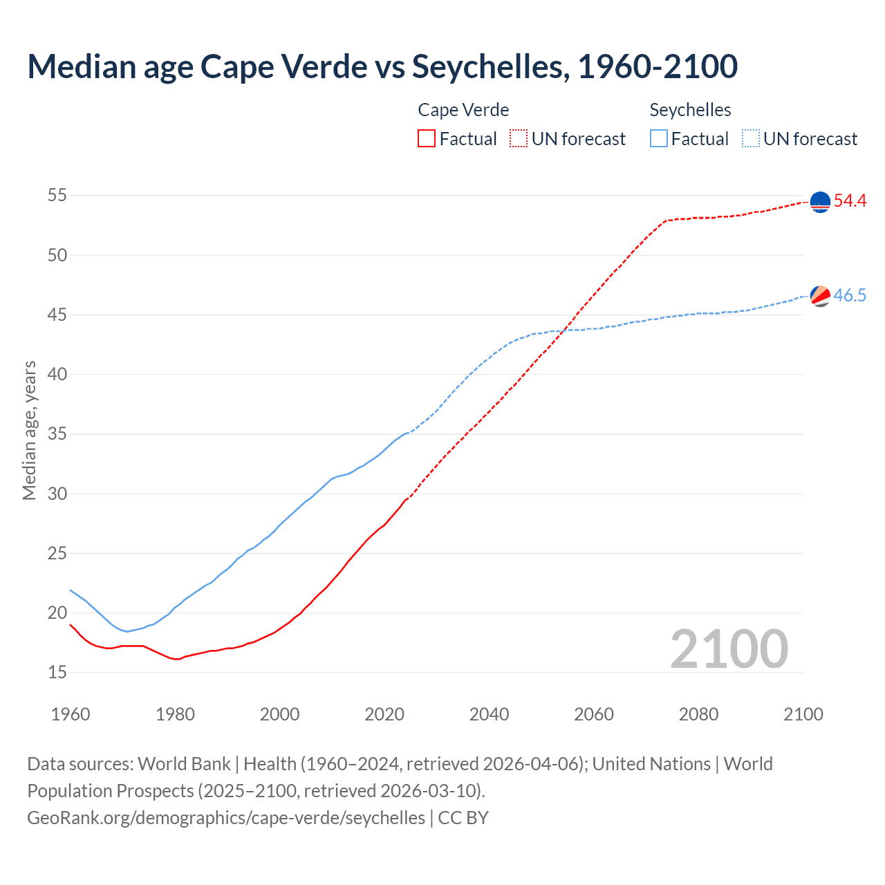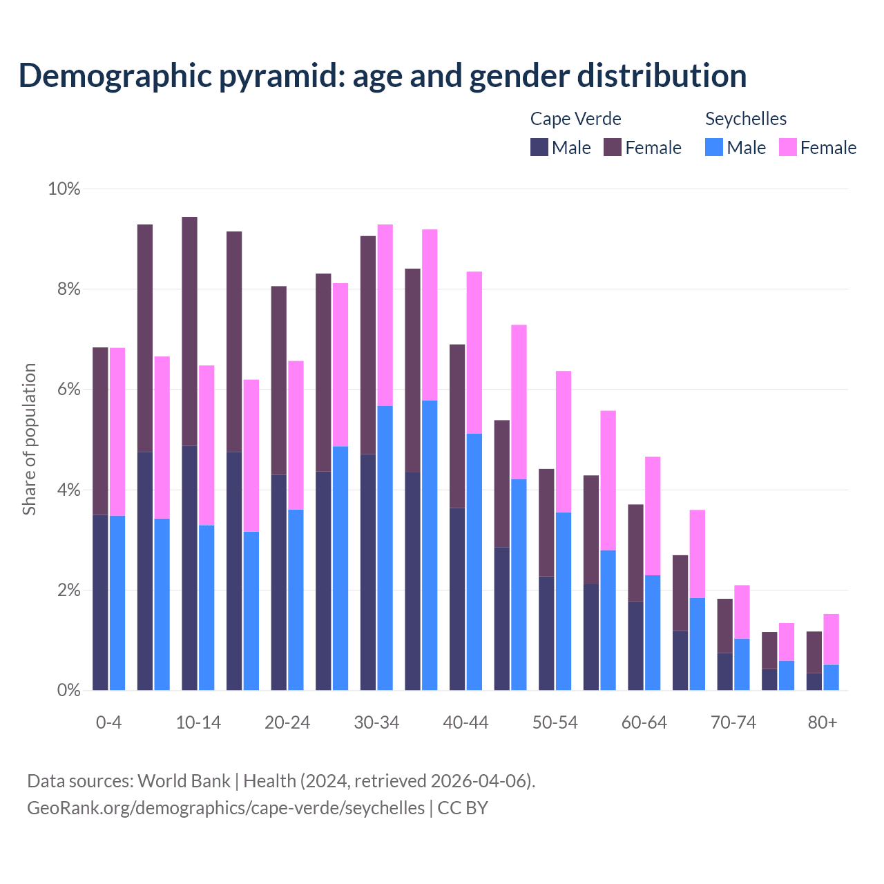 - As of 2026, the population of Cape Verde is 530K vs 126K in the Seychelles - 4.2 times difference.
