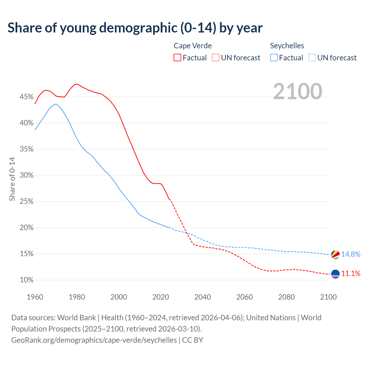 - The share of young demographic (0-15 years old) in Cape Verde is 25.5% vs 20% in the Seychelles.