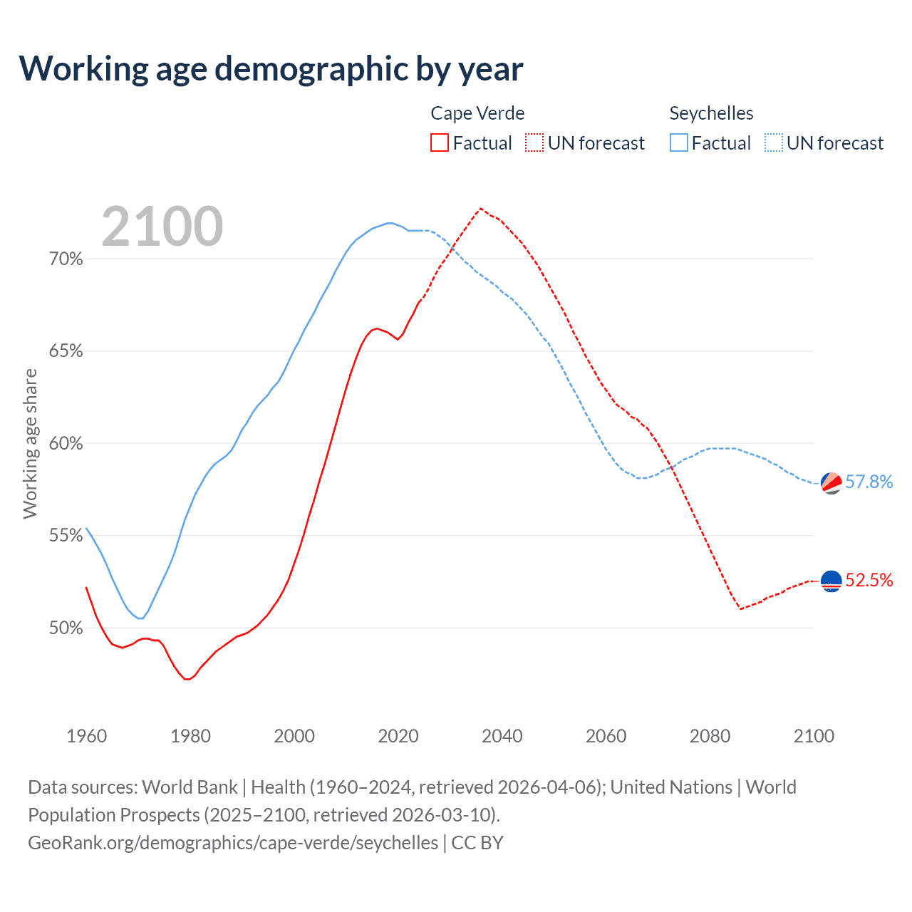 - Cape Verde has 359K working age adults (aged 15-64) vs 90.3K in the Seychelles.