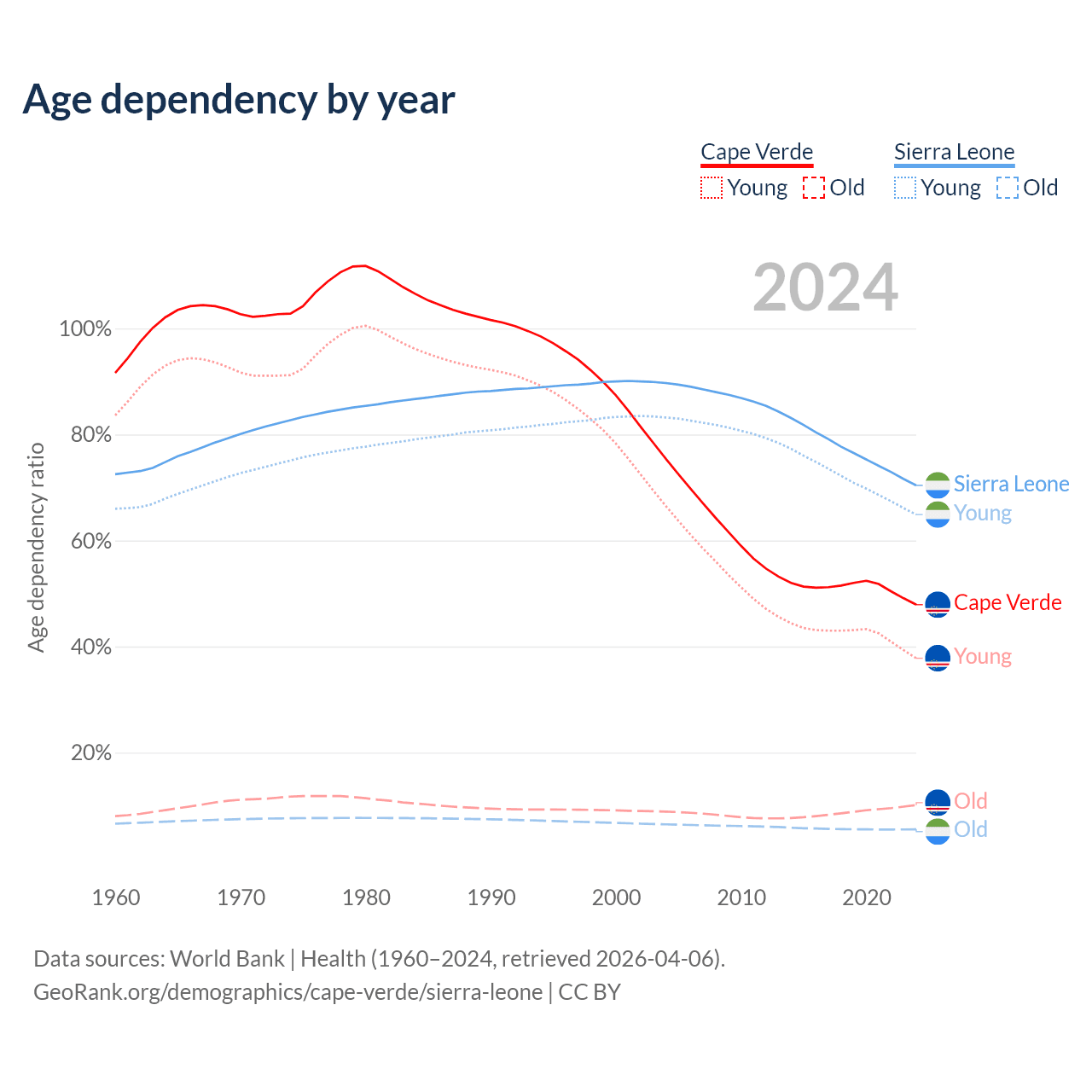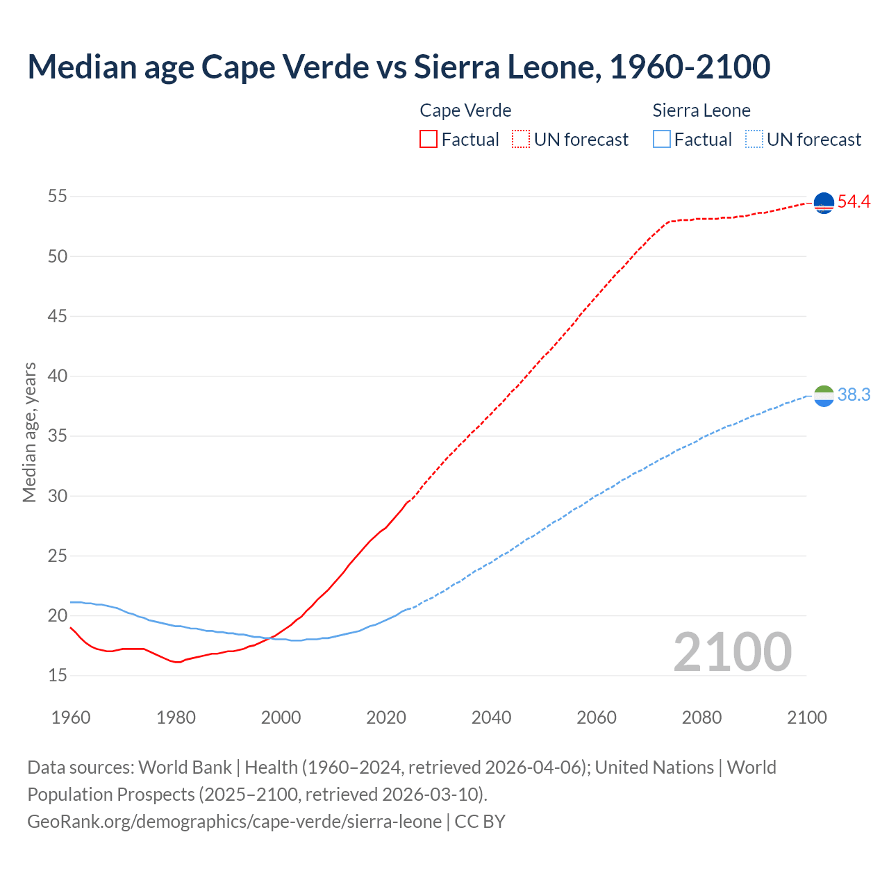 - Cape Verde is ranked 110/196 by median age (oldest to youngest) vs 161/196 for Sierra Leone.