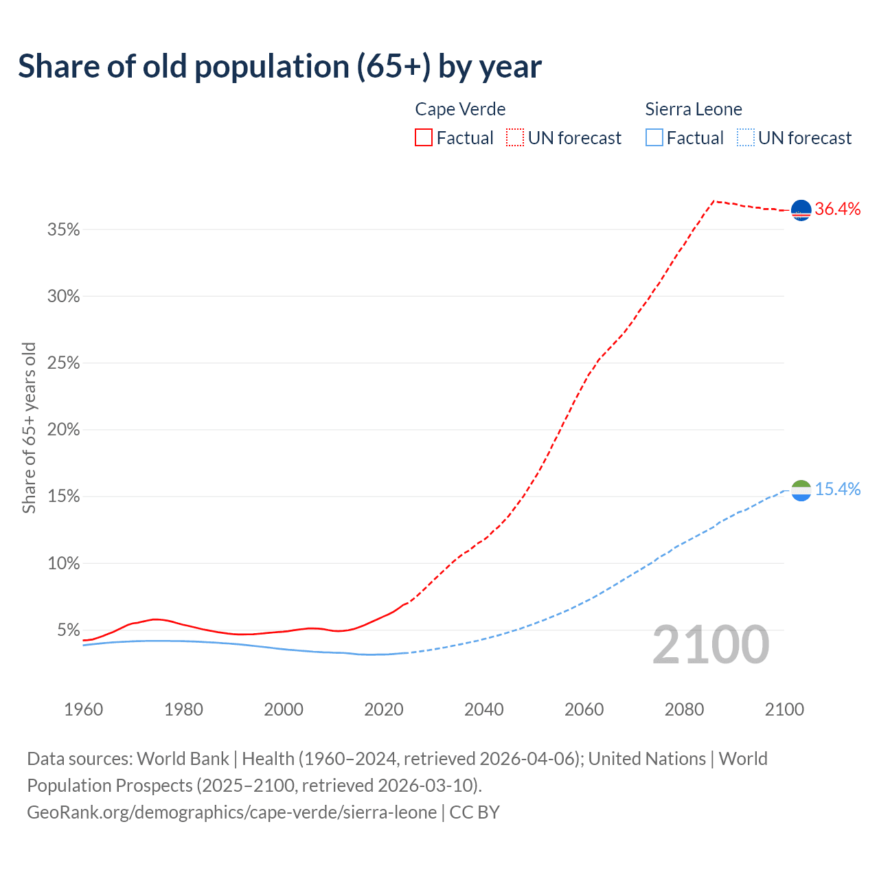 - The share of old-age demographic (65+) in Cape Verde is 6.86% vs 3.24% in Sierra Leone.