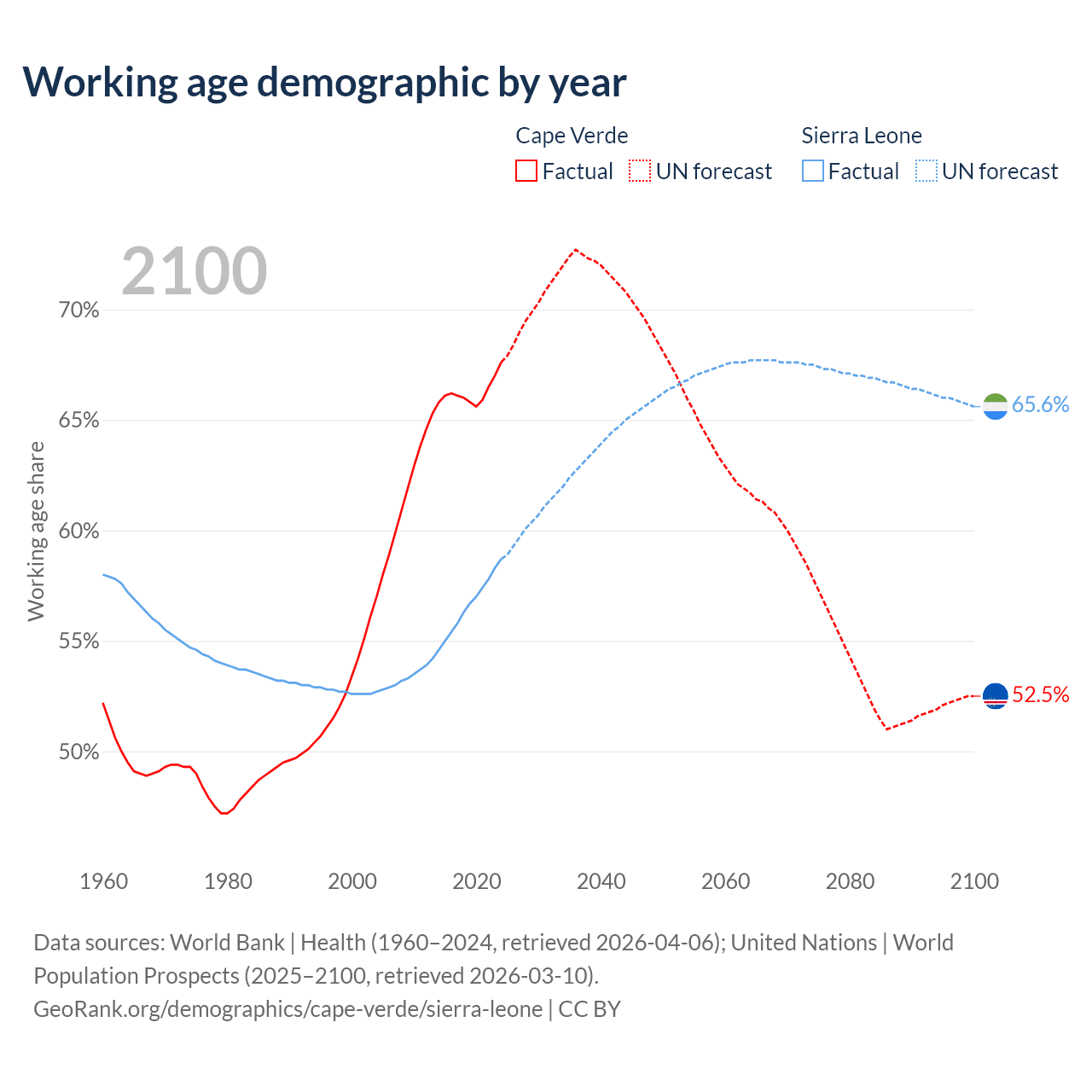- Cape Verde has 359K working age adults (aged 15-64) vs 5.31M in Sierra Leone.
