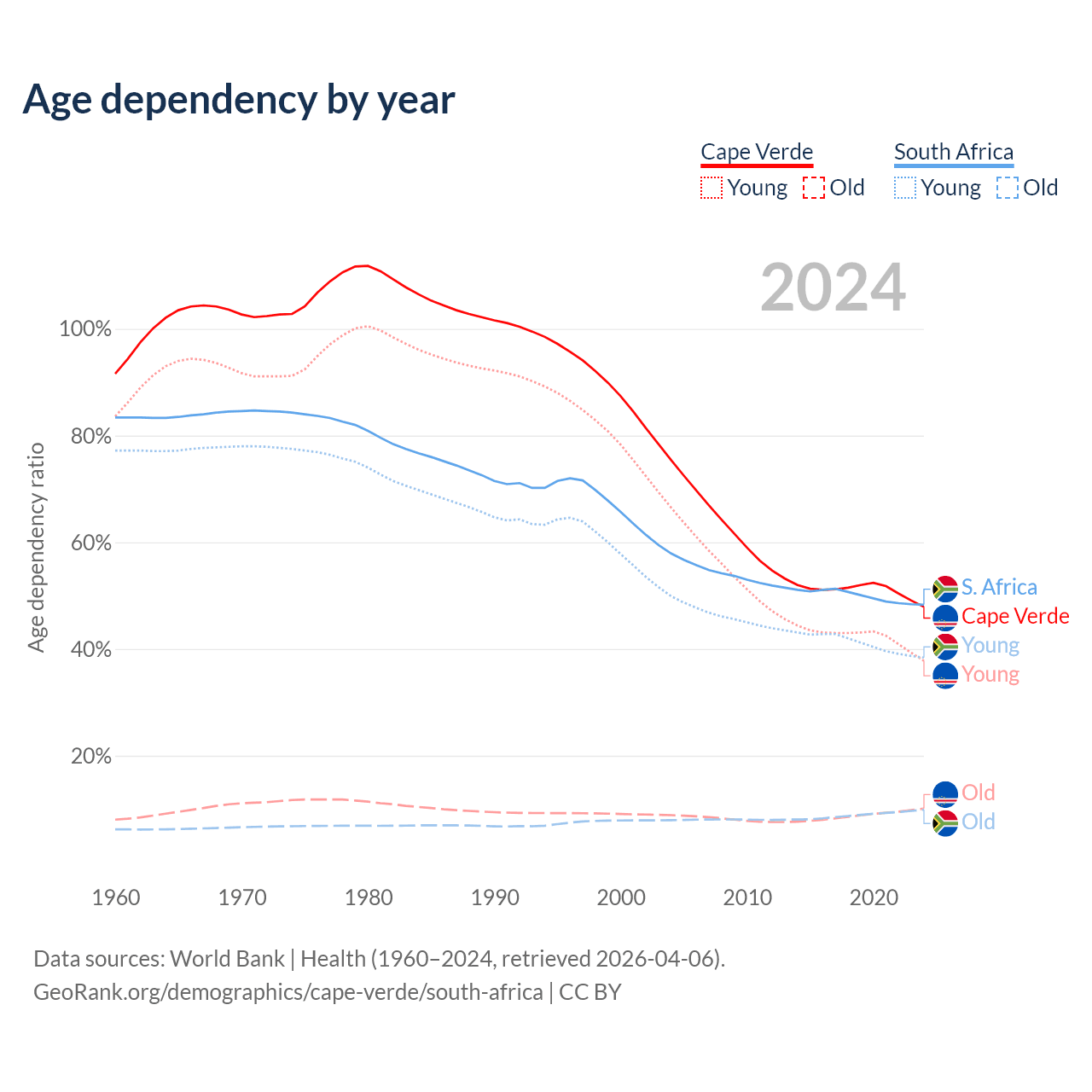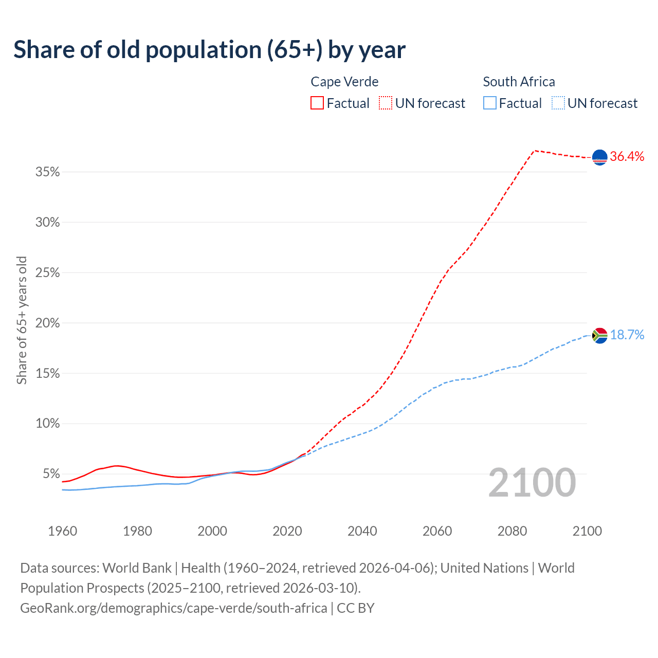 - The share of old-age demographic (65+) in Cape Verde is 6.86% vs 6.69% in South Africa.