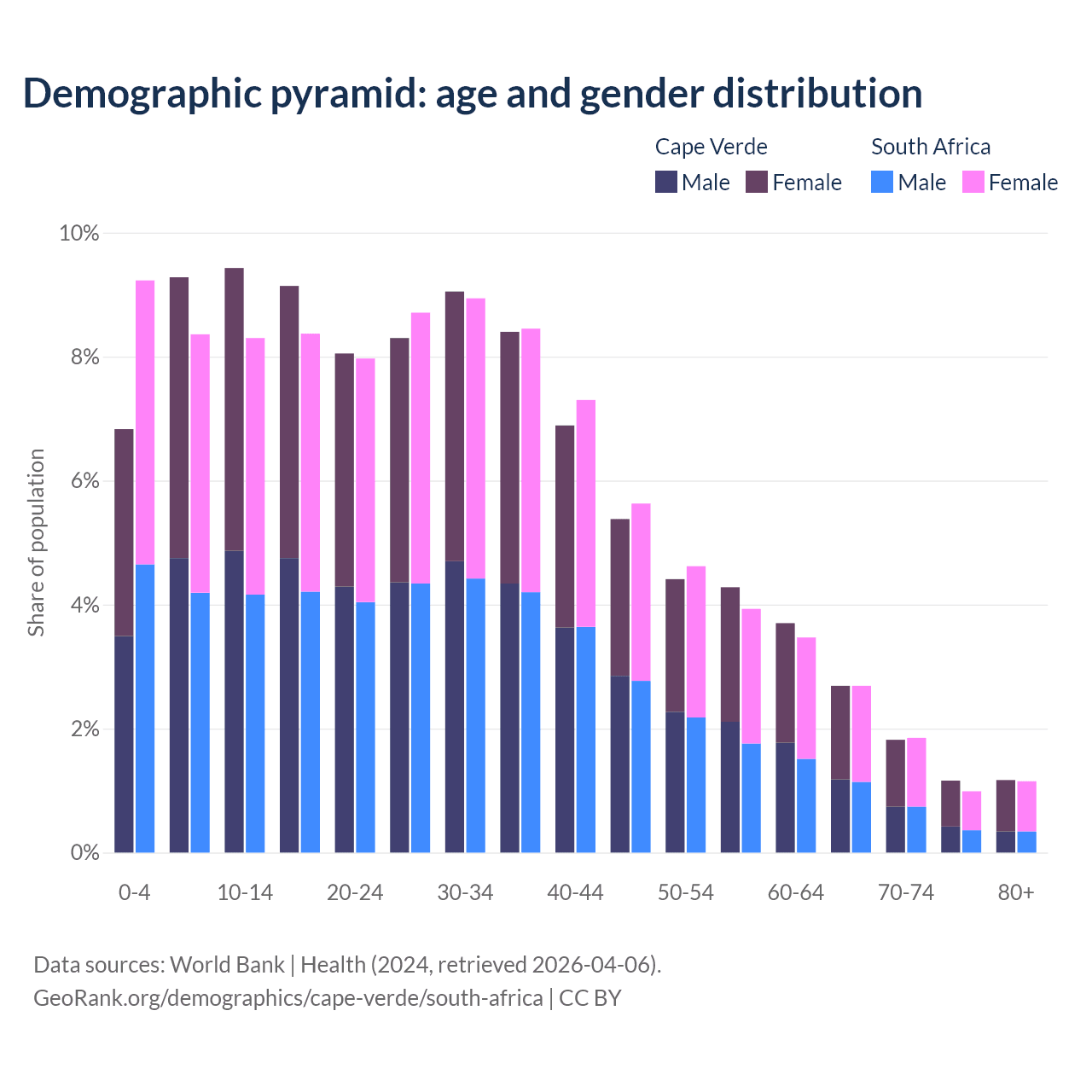 - Cape Verde is ranked 110/196 by median age (oldest to youngest) vs 107/196 for South Africa.