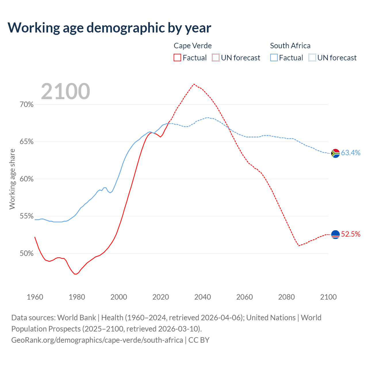 - Cape Verde has 359K working age adults (aged 15-64) vs 44.3M in South Africa.