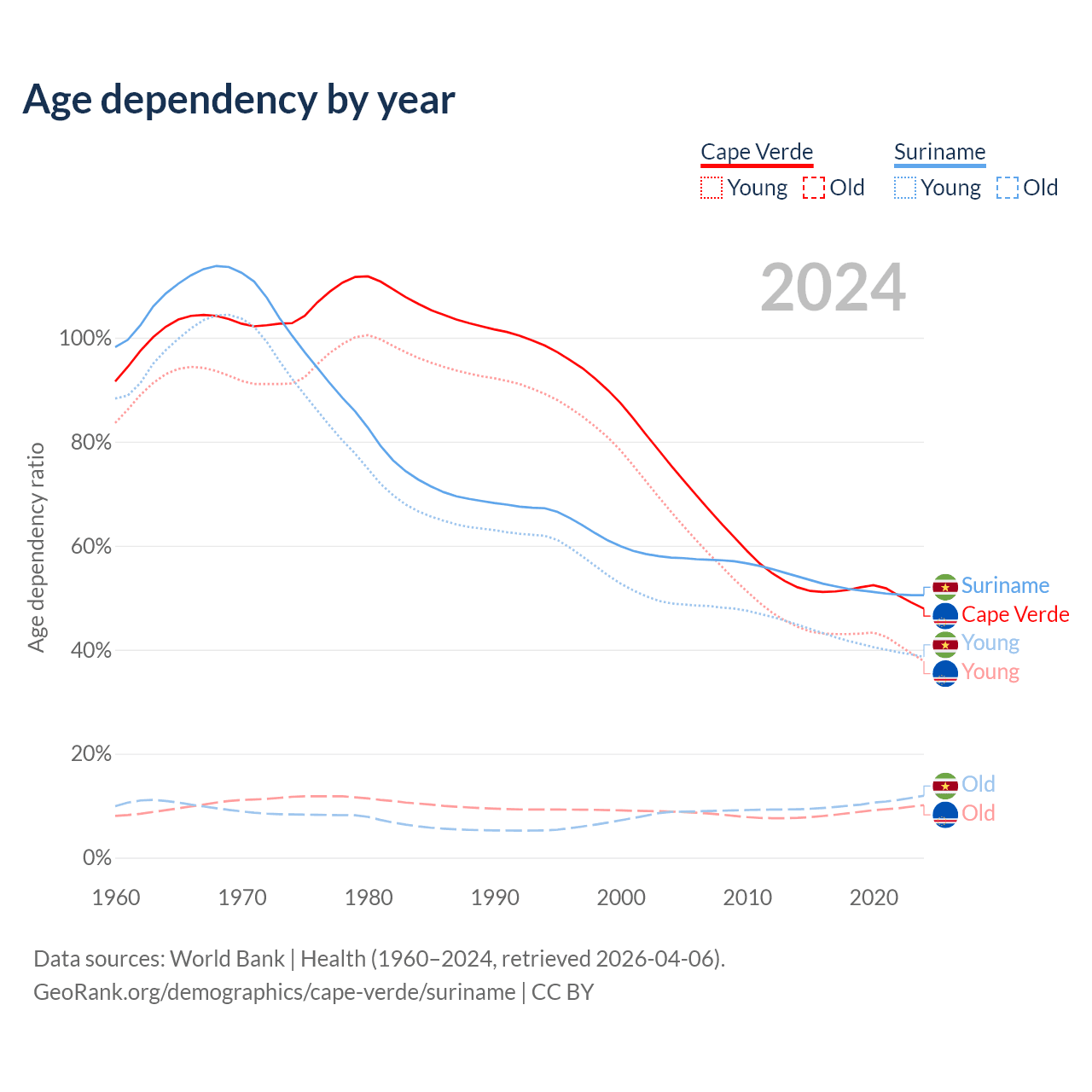 - The share of young demographic (0-15 years old) in Cape Verde is 25.5% vs 25.6% in Suriname.