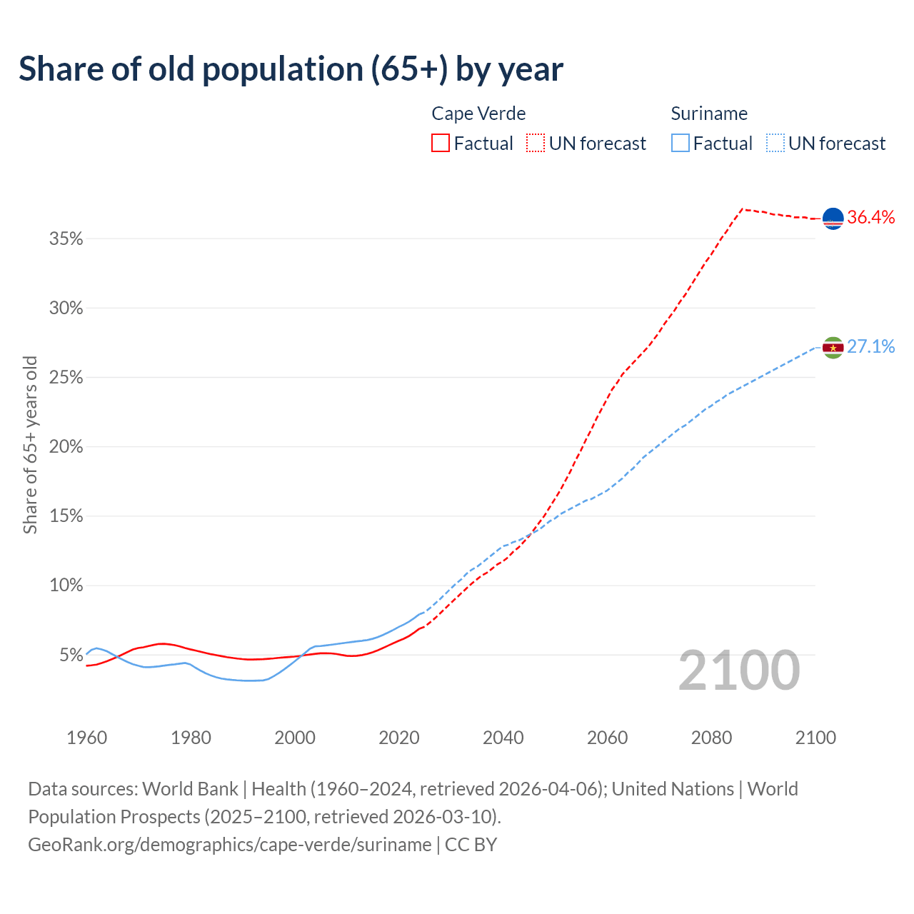 - The share of old-age demographic (65+) in Cape Verde is 6.86% vs 7.9% in Suriname.