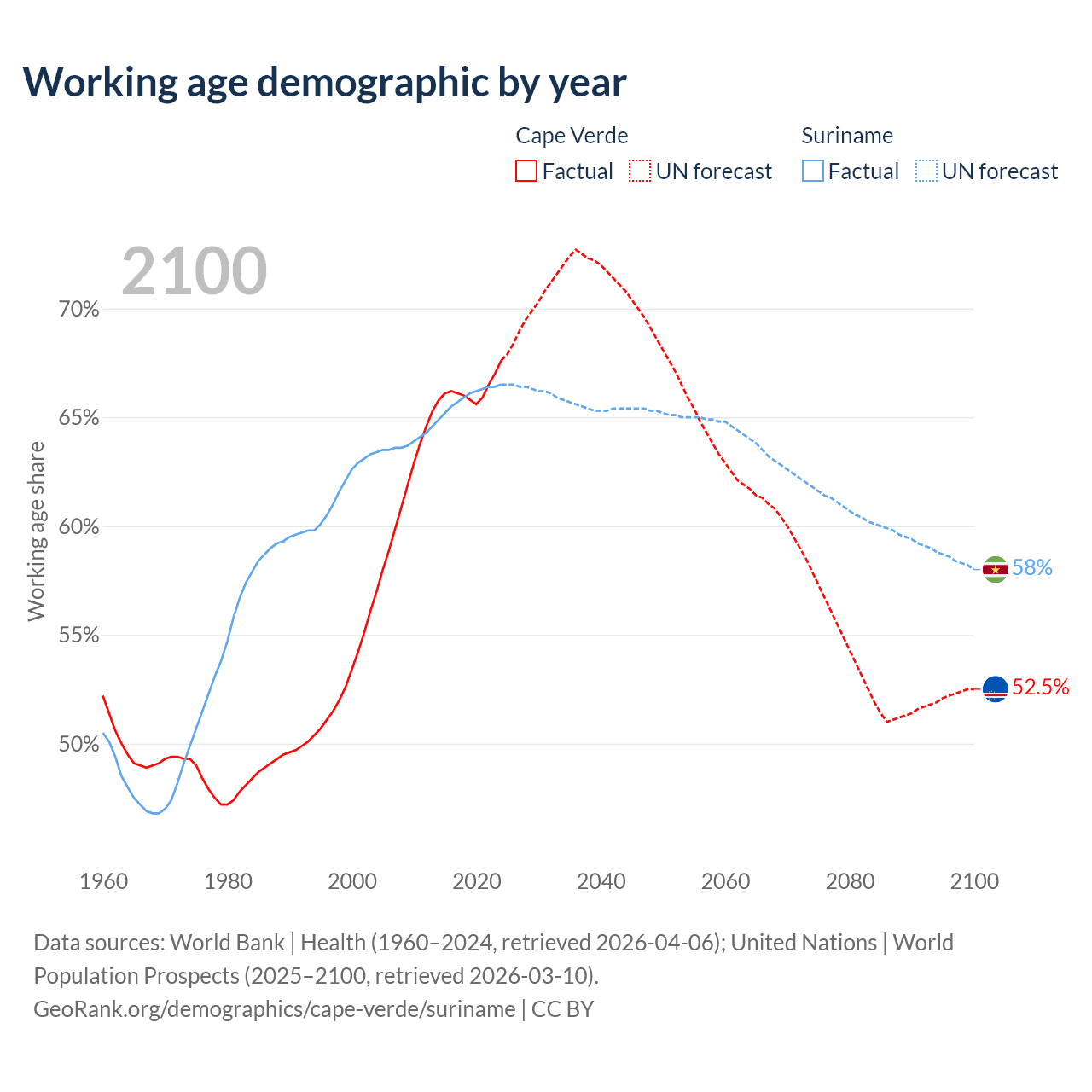 - Cape Verde has 359K working age adults (aged 15-64) vs 430K in Suriname.