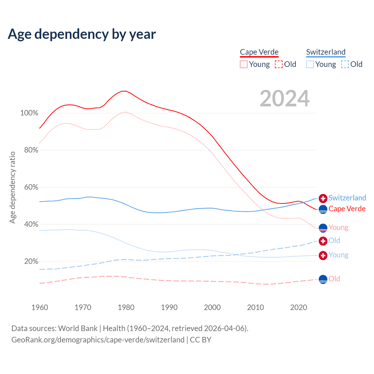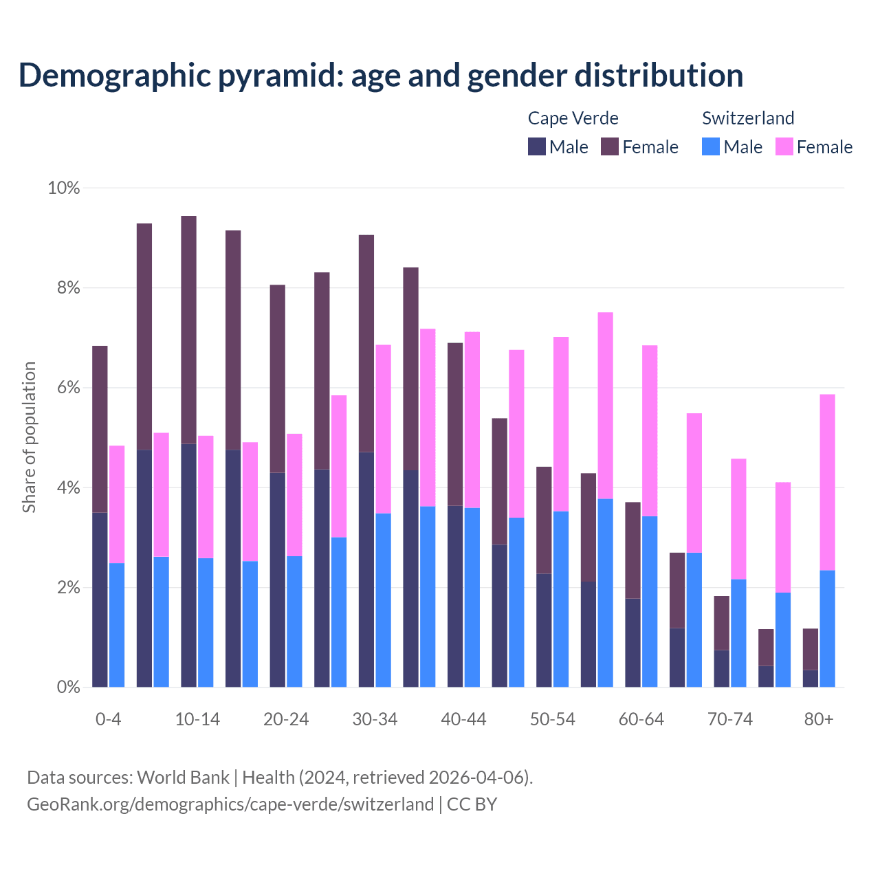 - Cape Verde is ranked 110/196 by median age (oldest to youngest) vs 24/196 for Switzerland.