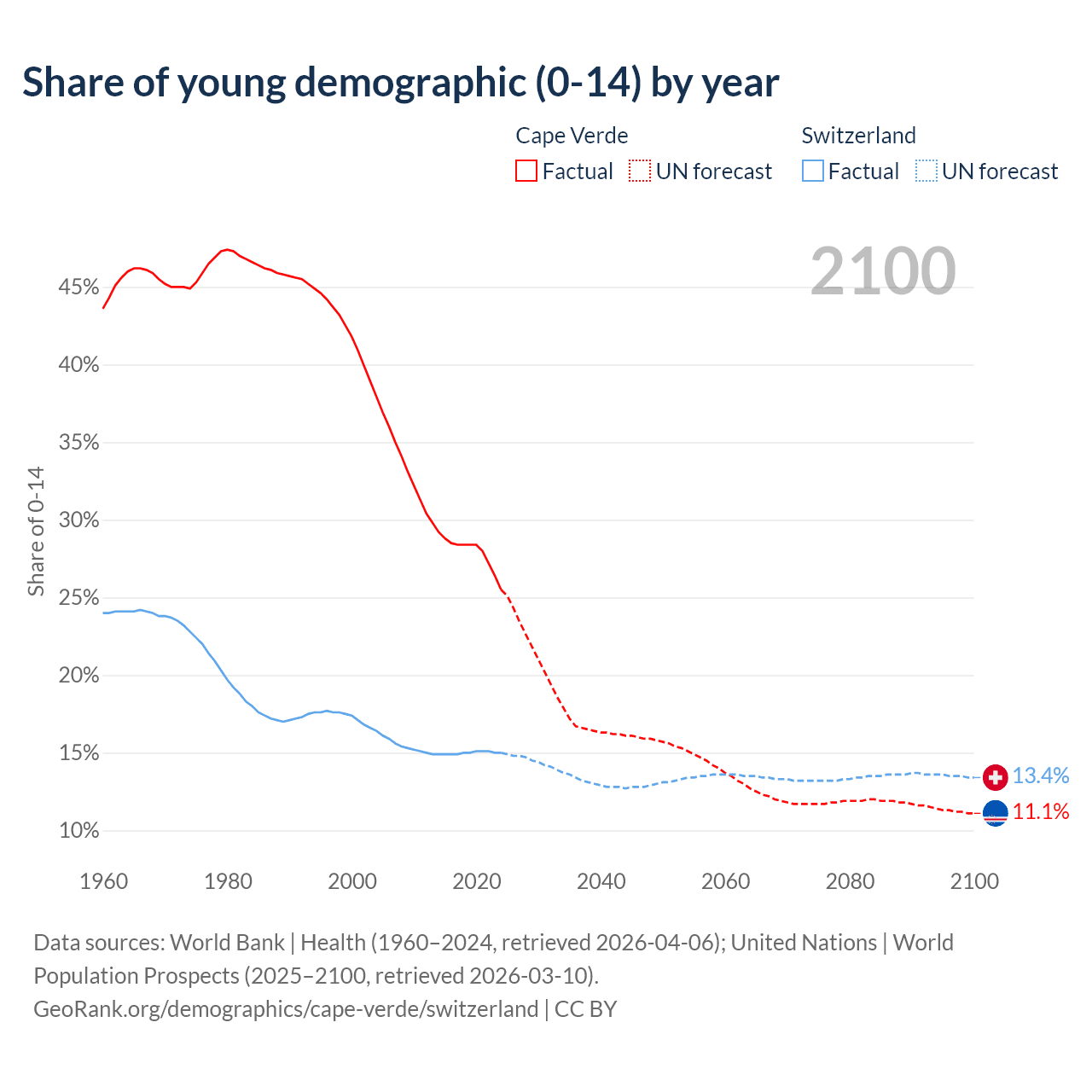 - The share of young demographic (0-15 years old) in Cape Verde is 25.5% vs 15% in Switzerland.