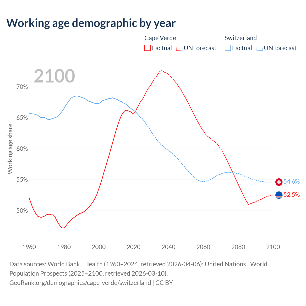- Cape Verde has 359K working age adults (aged 15-64) vs 5.92M in Switzerland.