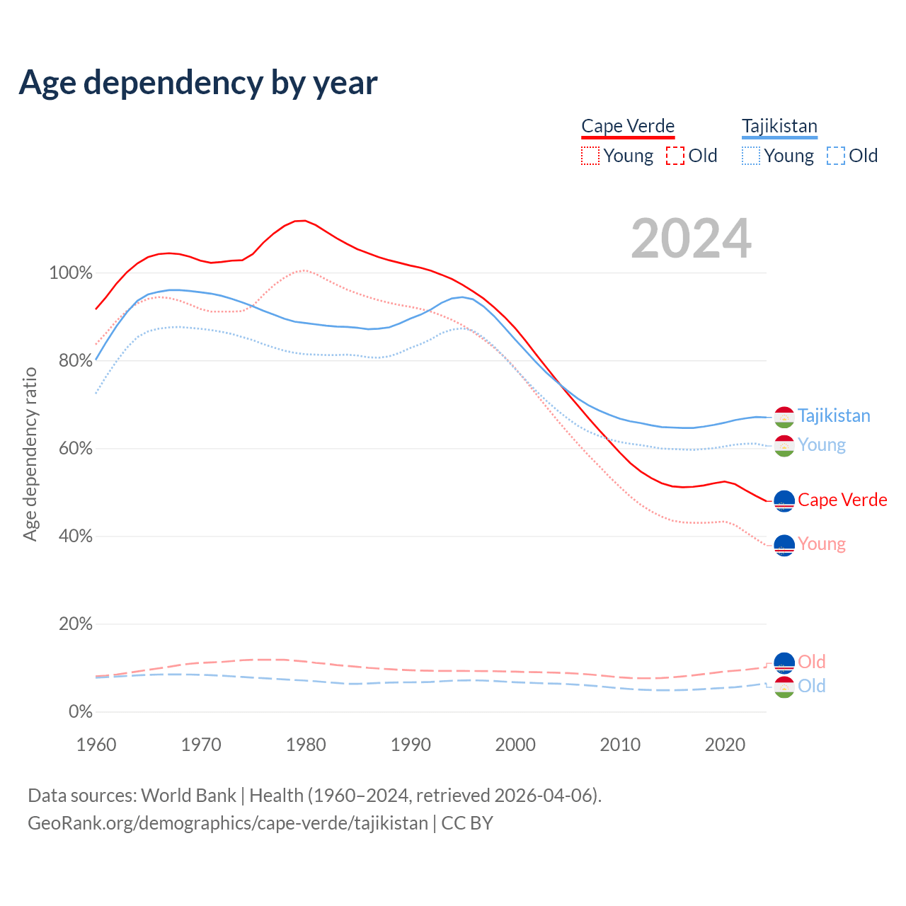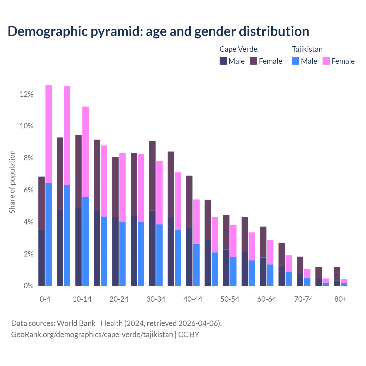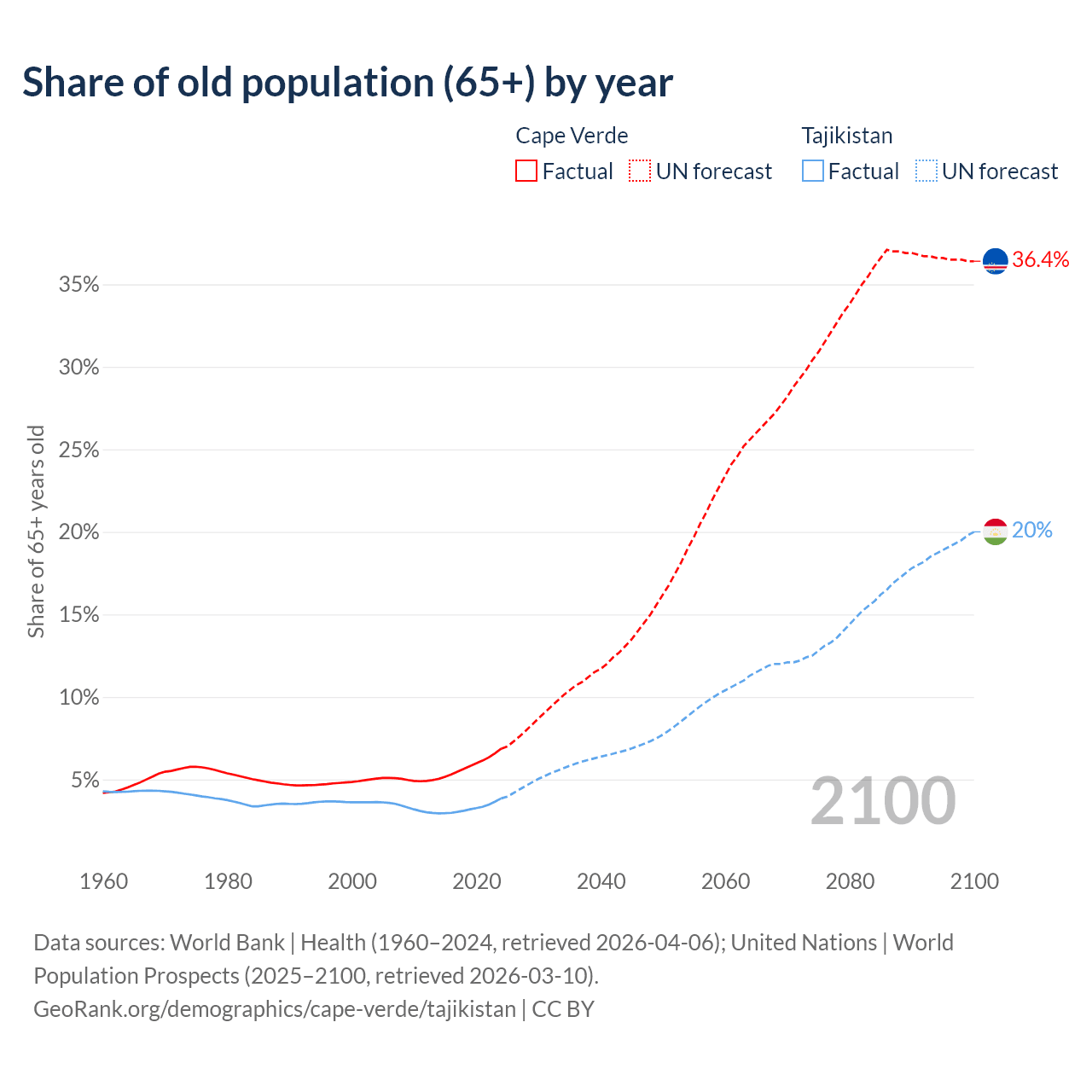 - The share of old-age demographic (65+) in Cape Verde is 6.86% vs 3.85% in Tajikistan.