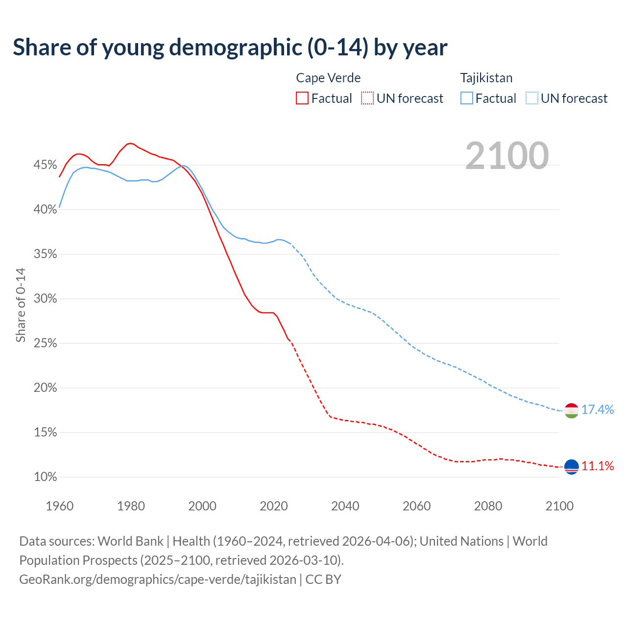 - The share of young demographic (0-15 years old) in Cape Verde is 25.5% vs 36.3% in Tajikistan.
