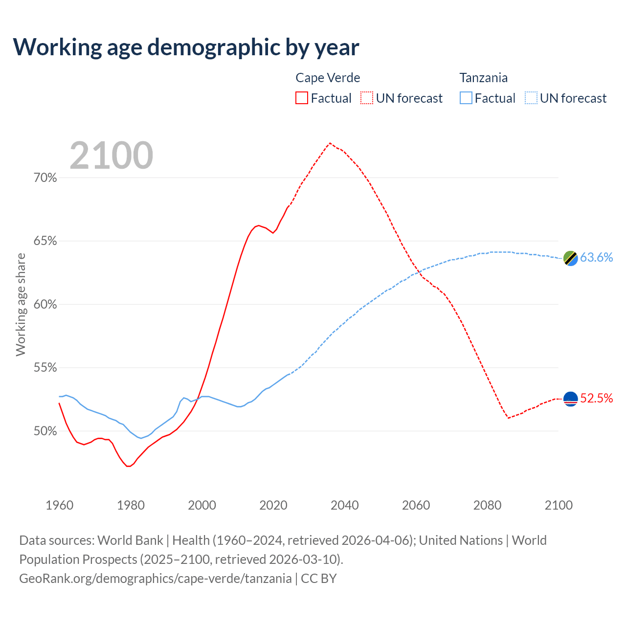 - Cape Verde has 359K working age adults (aged 15-64) vs 39.8M in Tanzania.