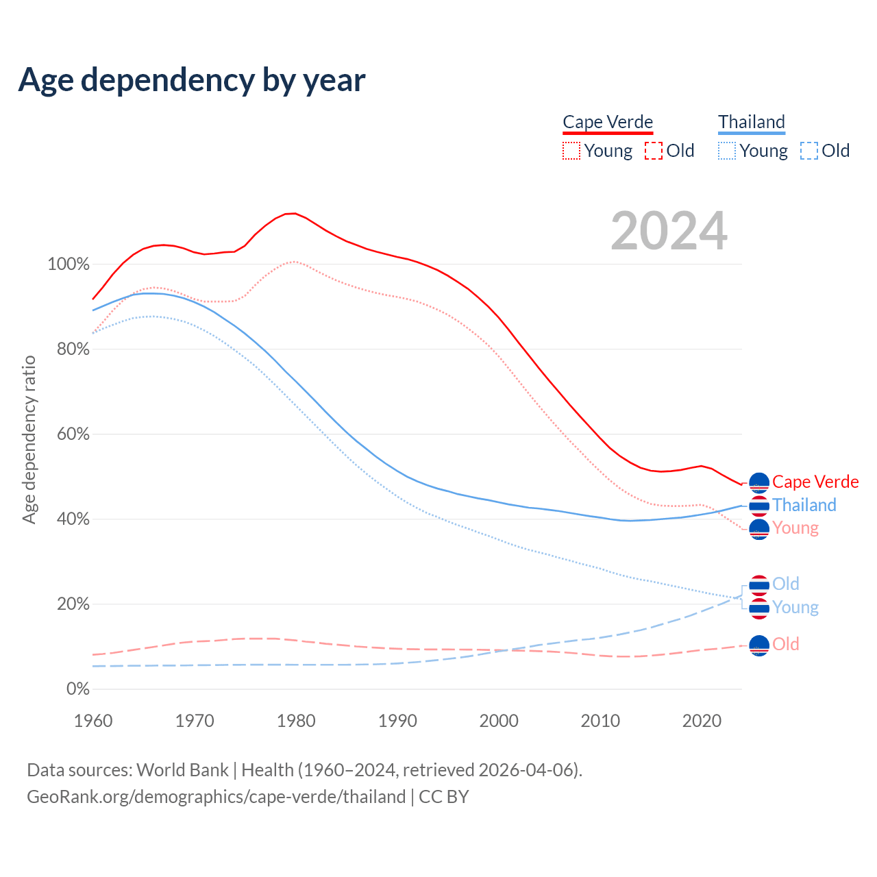 - Cape Verde is ranked 110/196 by median age (oldest to youngest) vs 40/196 for Thailand.