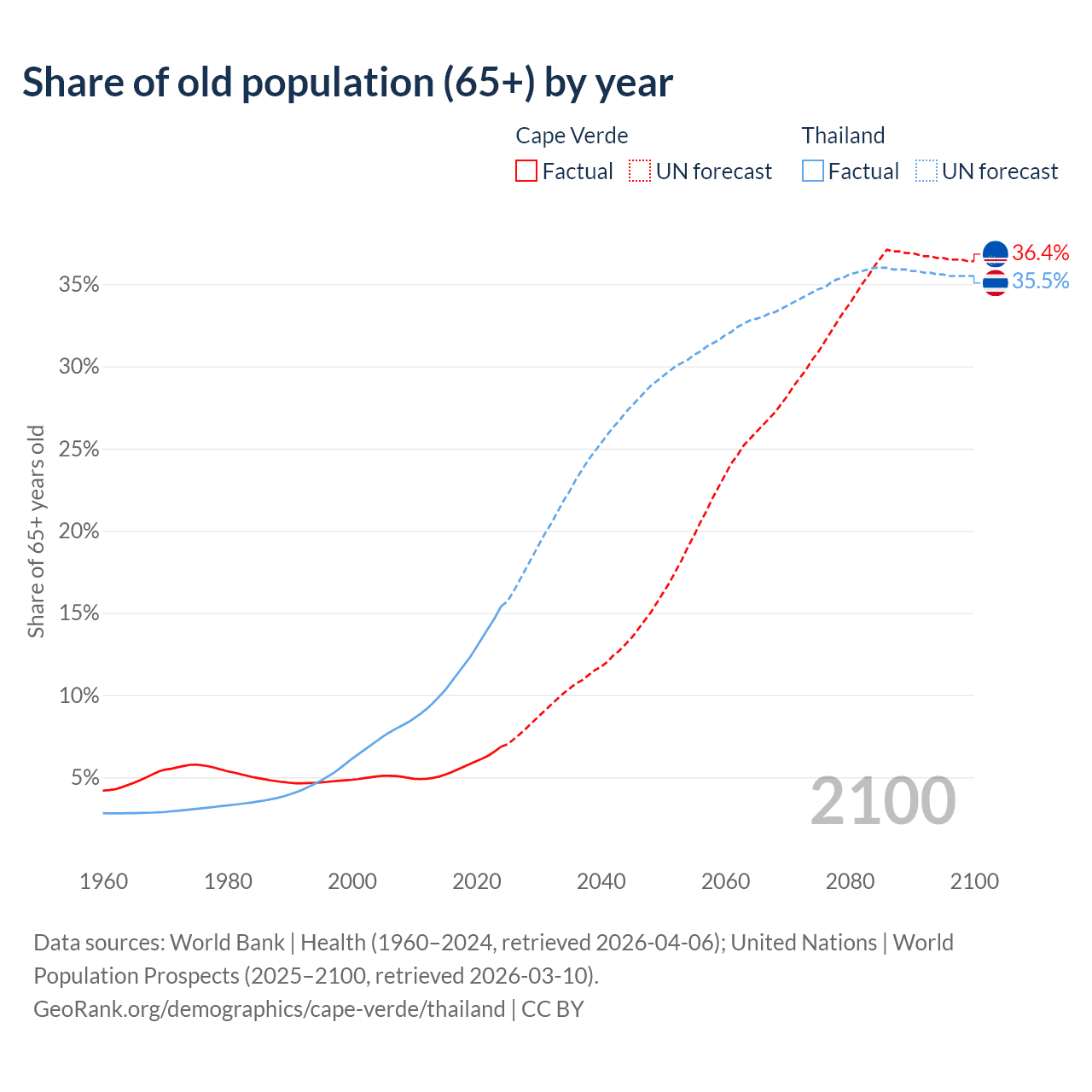 The share of older people aged 65 and over is 6.86% in Cape Verde and 15.4% in Thailand. Life expectancy in Cape Verde compared to Thailand .