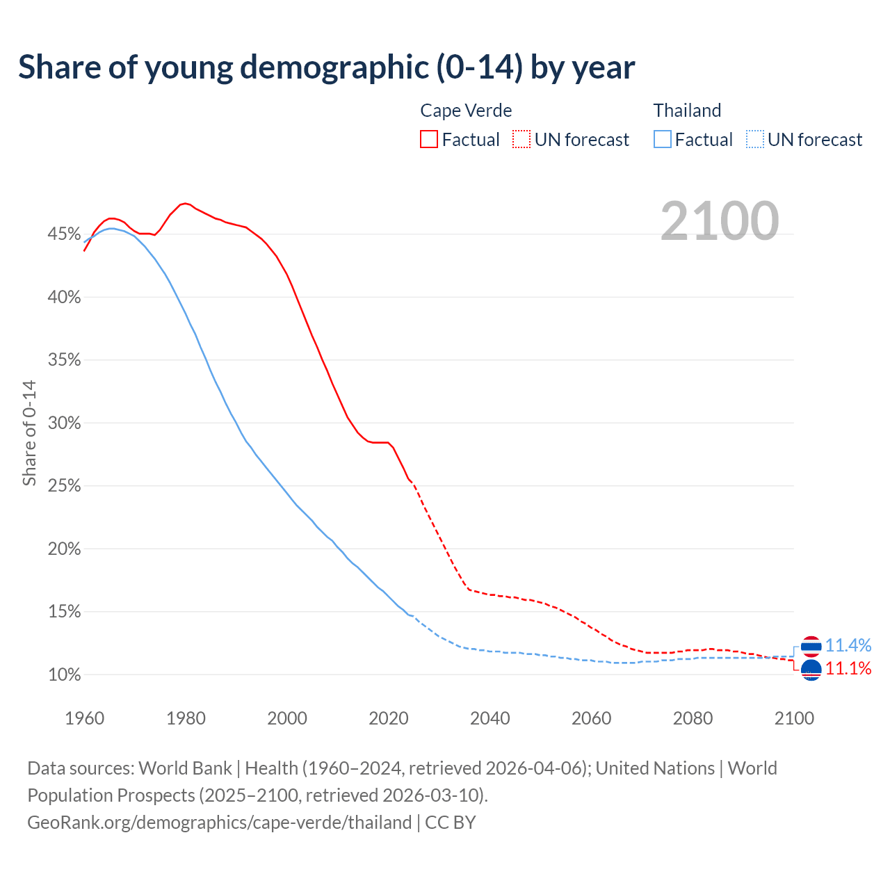 - The share of young demographic (0-15 years old) in Cape Verde is 25.5% vs 14.7% in Thailand.