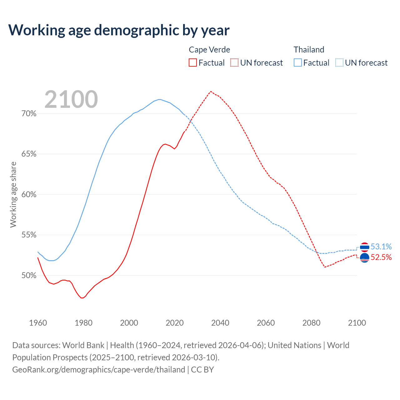- As of 2026, the population of Cape Verde is 530K vs 71.6M in Thailand - 134.9 times difference.