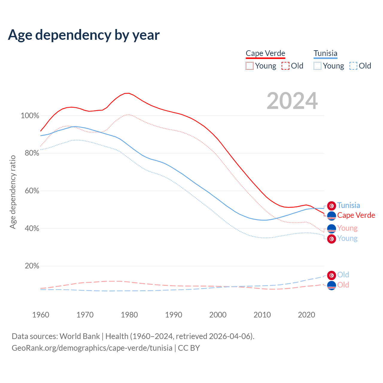 - Cape Verde is ranked 110/196 by median age (oldest to youngest) vs 86/196 for Tunisia.