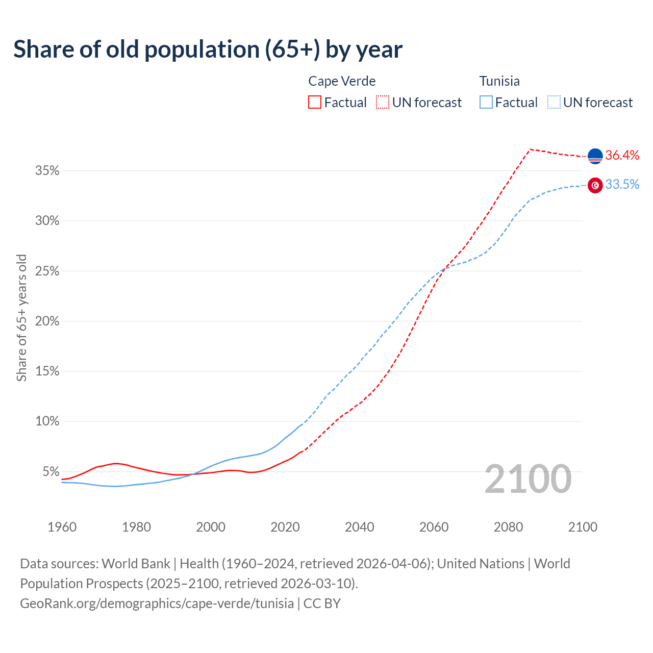 The share of older people aged 65 and over is 6.86% in Cape Verde and 9.53% in Tunisia. Life expectancy in Cape Verde compared to Tunisia .