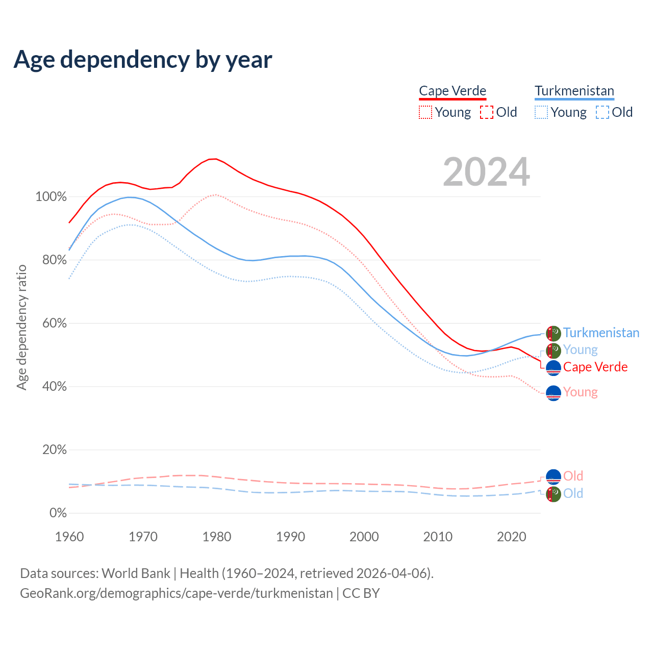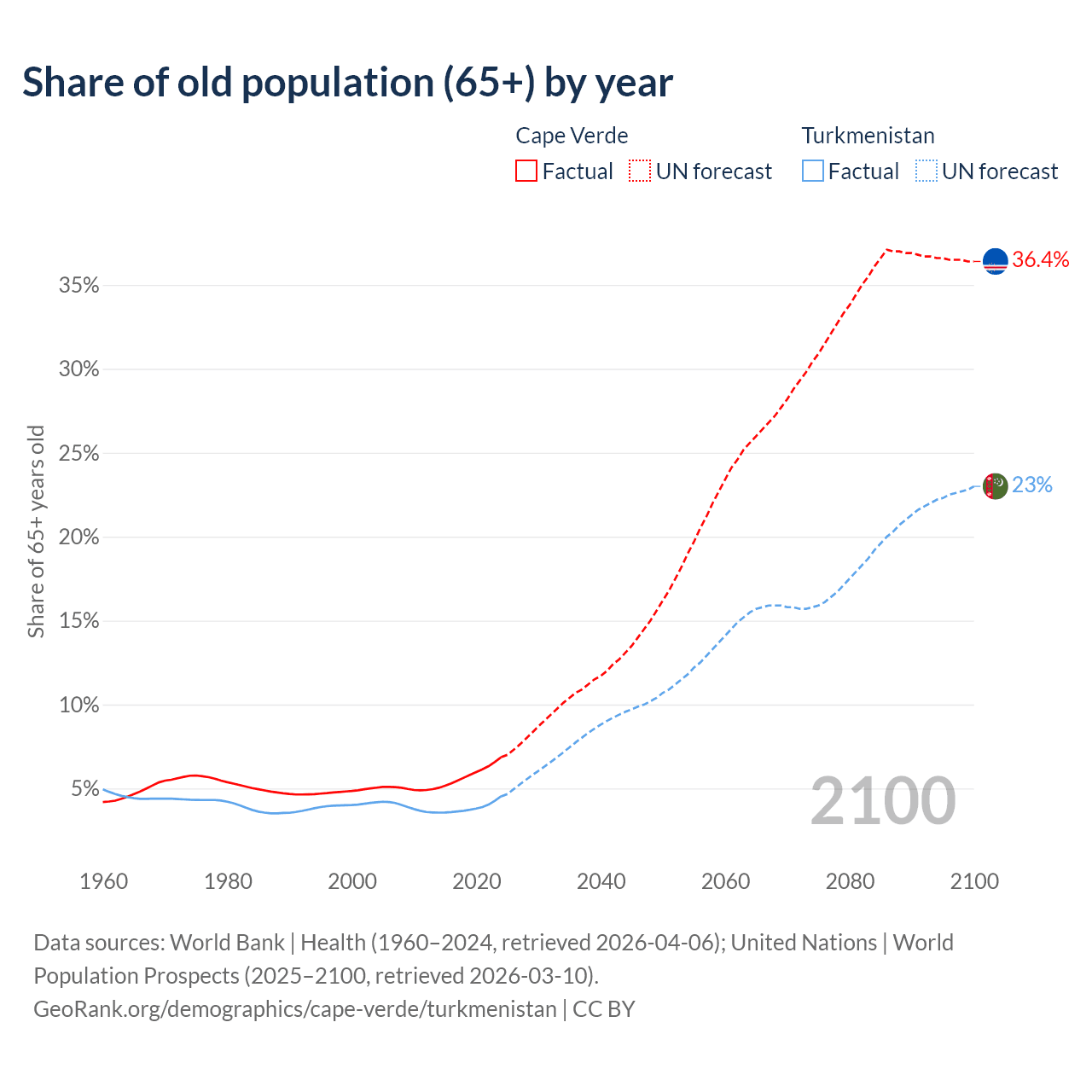 - The share of old-age demographic (65+) in Cape Verde is 6.86% vs 4.53% in Turkmenistan.