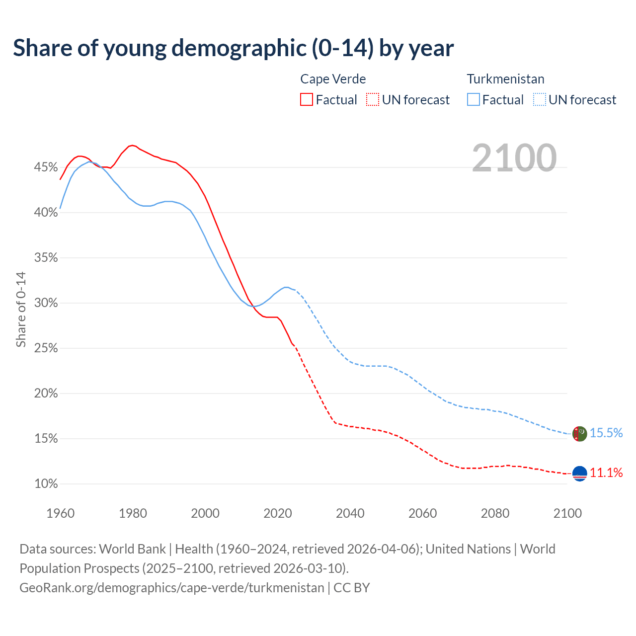 - The share of young demographic (0-15 years old) in Cape Verde is 25.5% vs 31.5% in Turkmenistan.