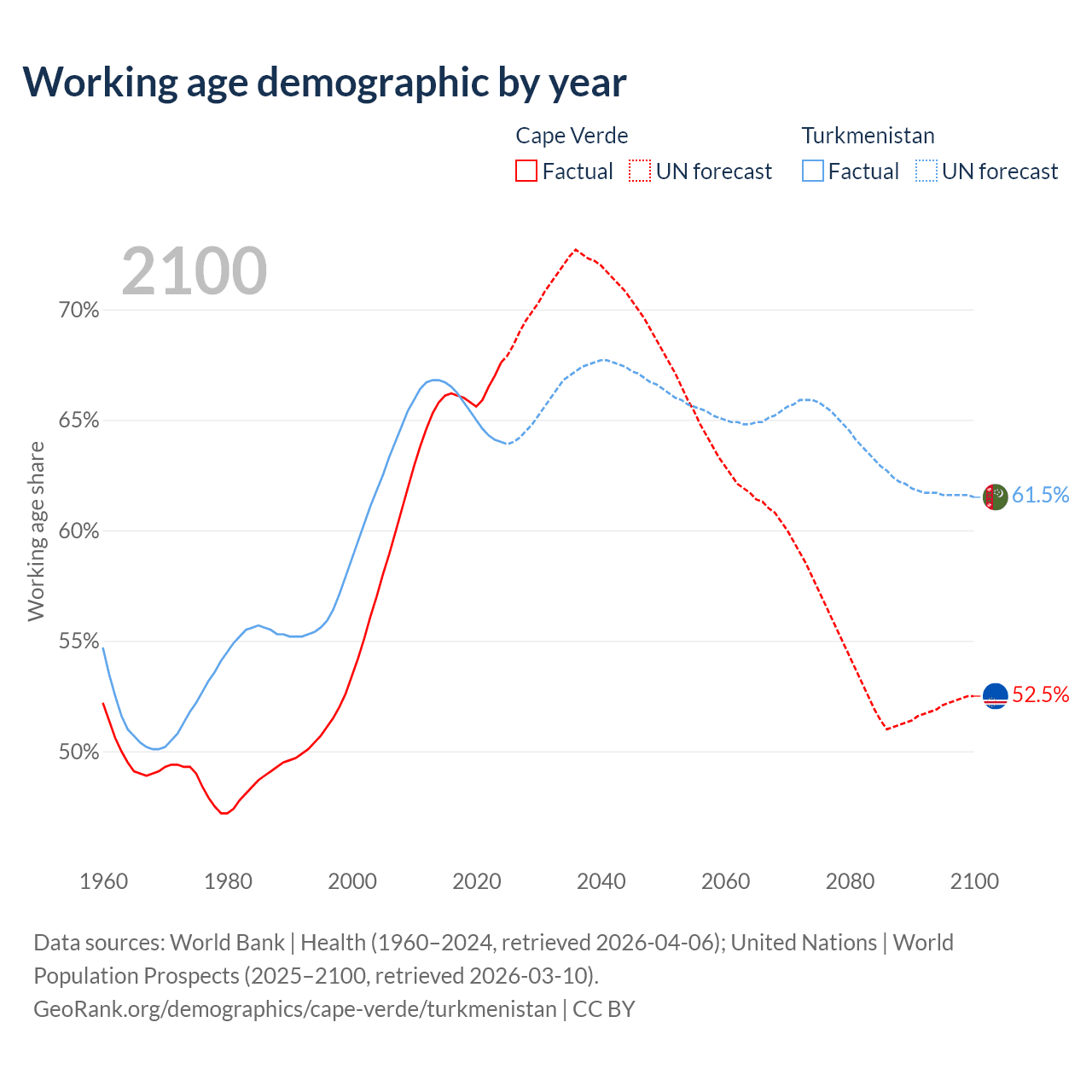 Median age Cape Verde vs Turkmenistan, 1960-2100