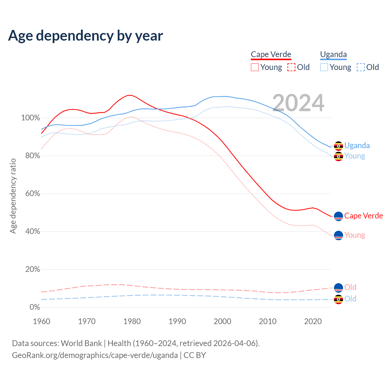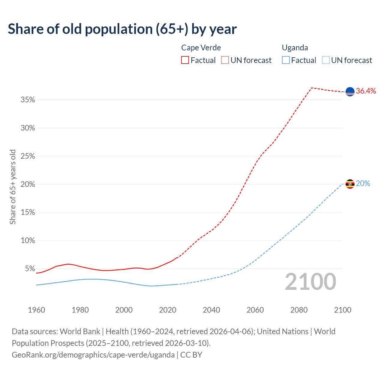 - The share of old-age demographic (65+) in Cape Verde is 6.86% vs 2.19% in Uganda.