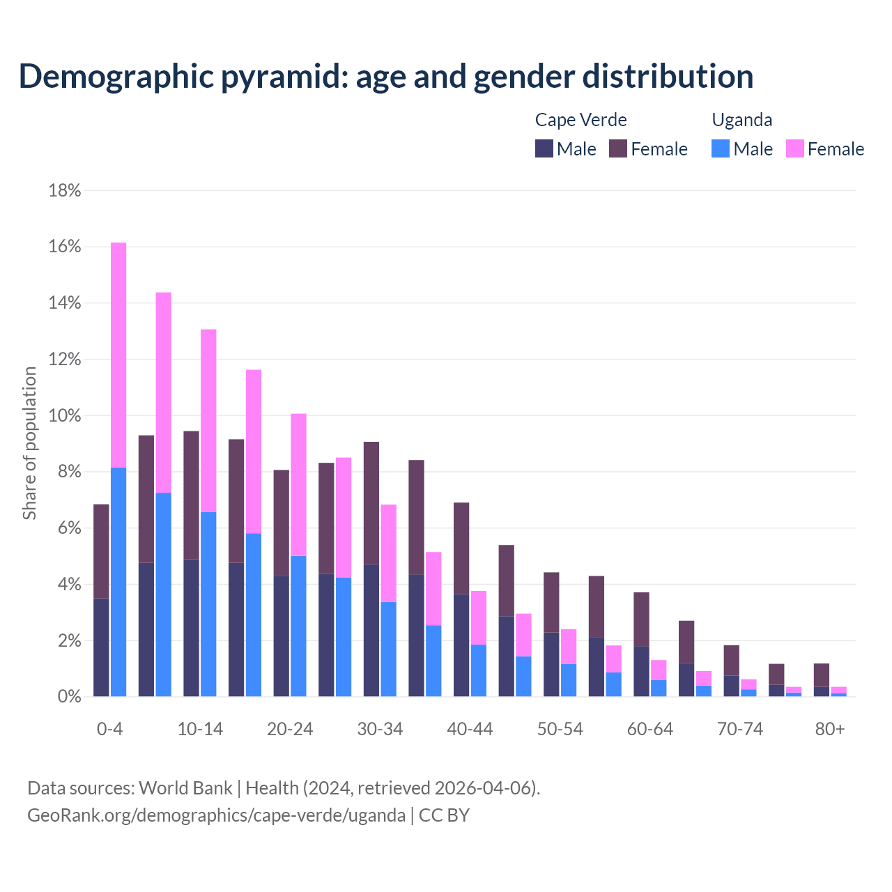 - Cape Verde is ranked 110/196 by median age (oldest to youngest) vs 187/196 for Uganda.