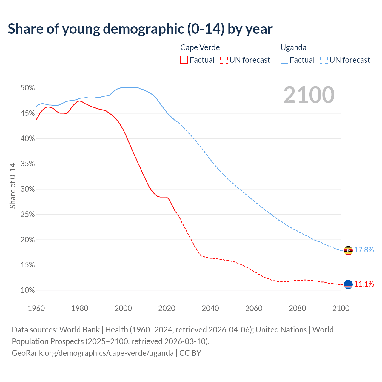 - The share of young demographic (0-15 years old) in Cape Verde is 25.5% vs 43.5% in Uganda.