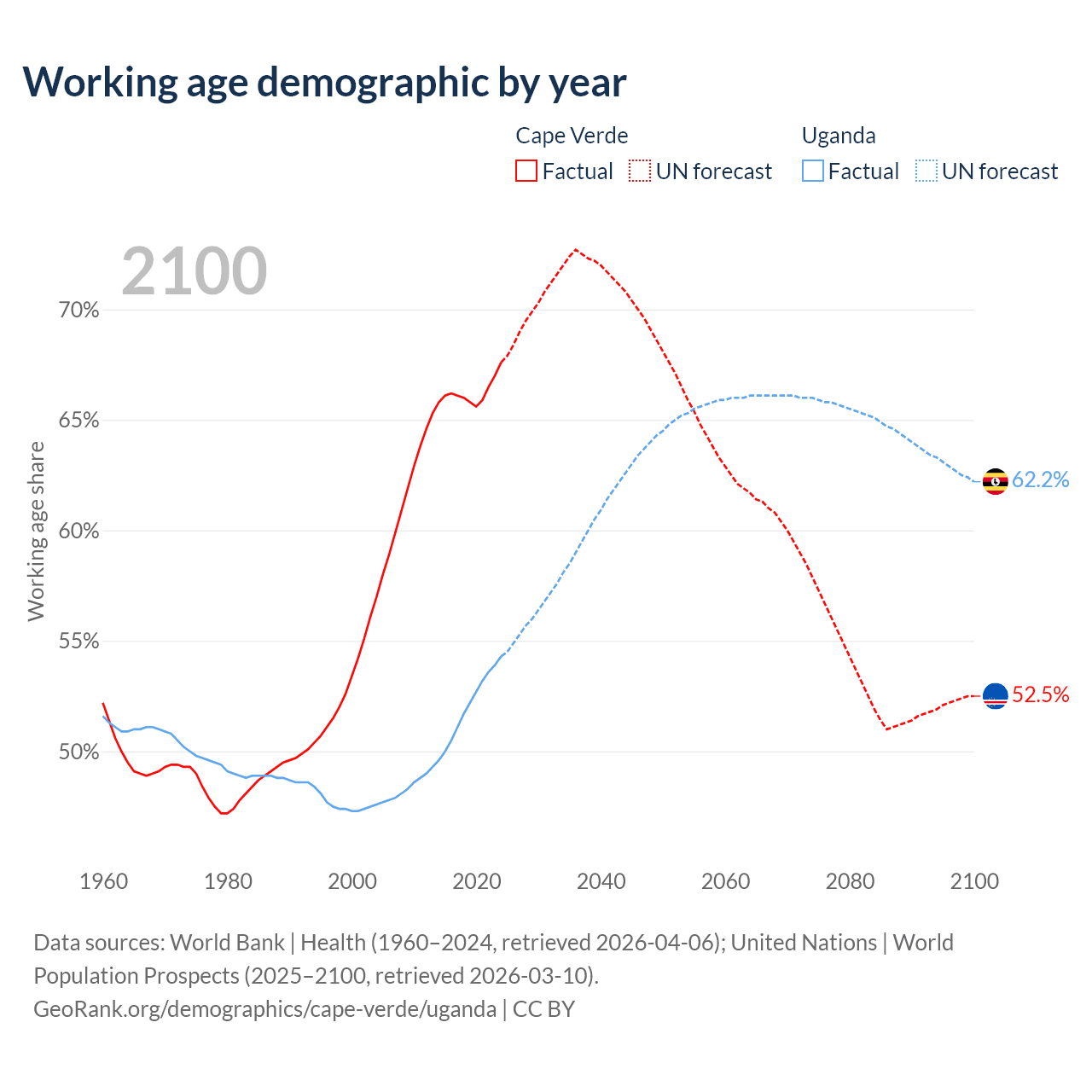 - Cape Verde has 359K working age adults (aged 15-64) vs 28.9M in Uganda.