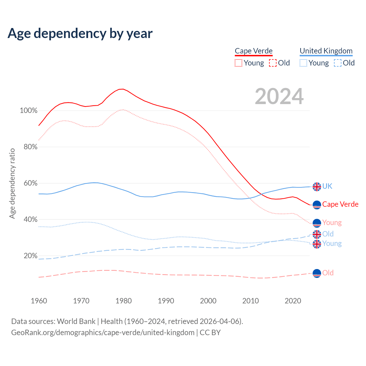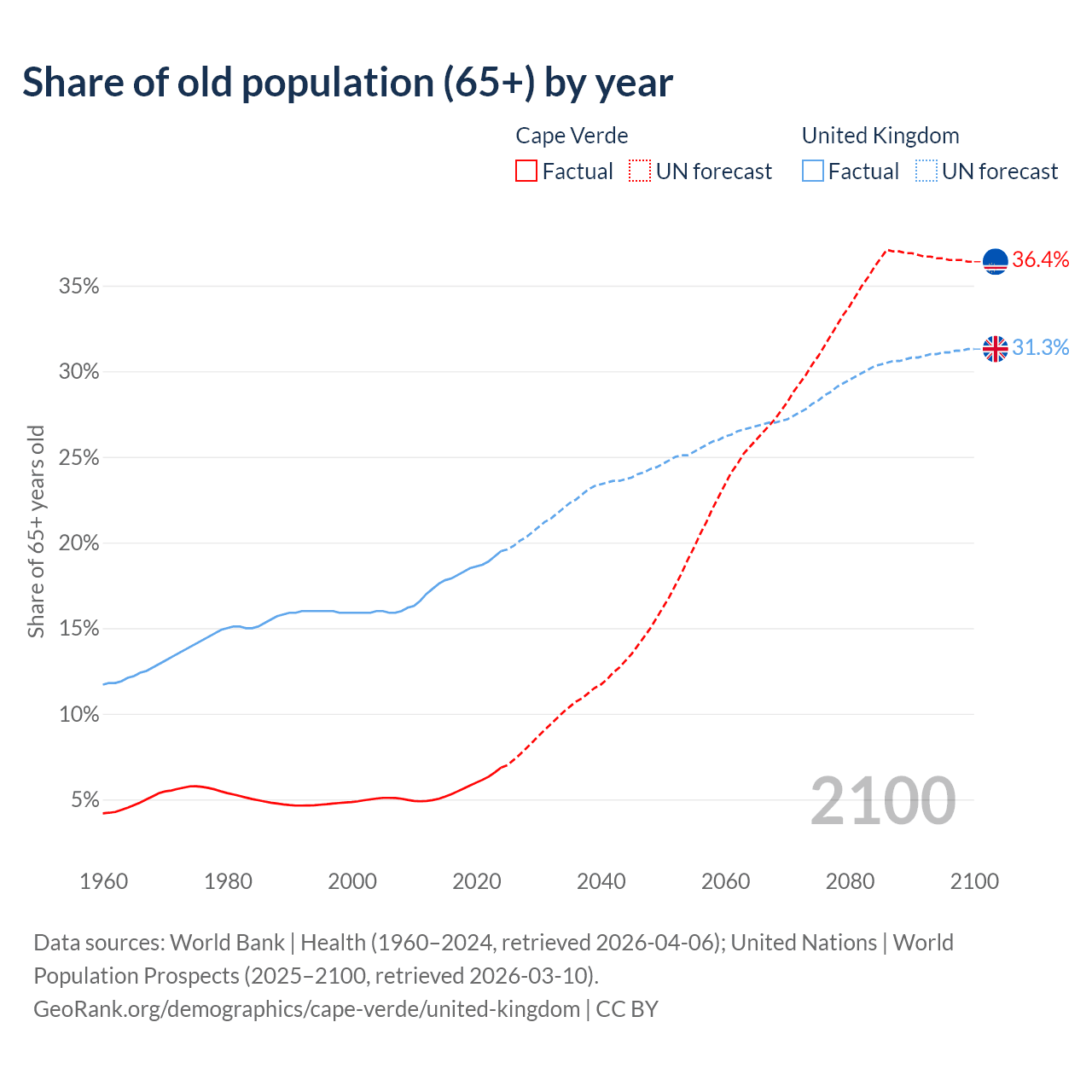 The share of older people aged 65 and over is 6.86% in Cape Verde and 19.5% in the United Kingdom. Life expectancy in Cape Verde compared to the United Kingdom .