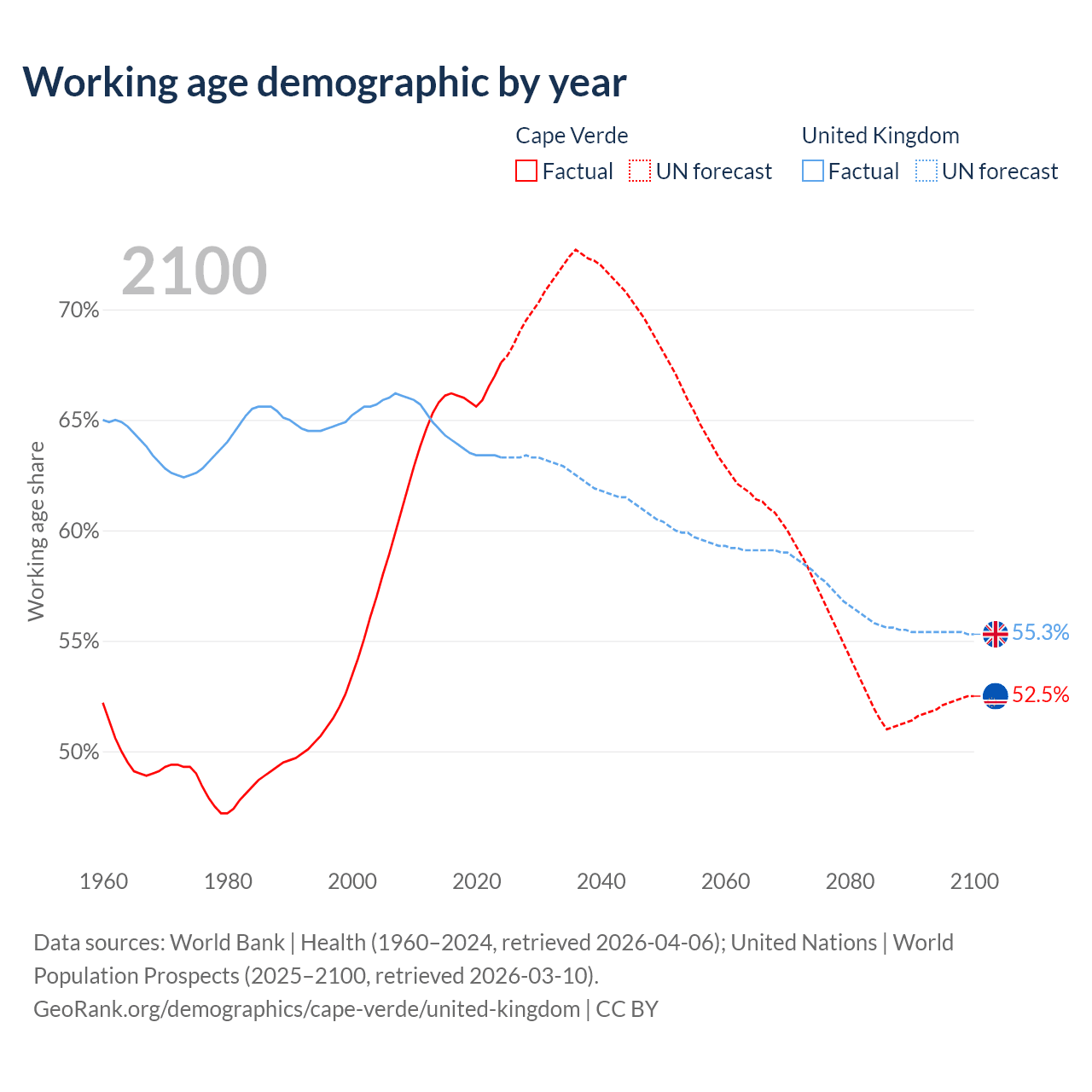 - Cape Verde has 359K working age adults (aged 15-64) vs 44.4M in the United Kingdom.