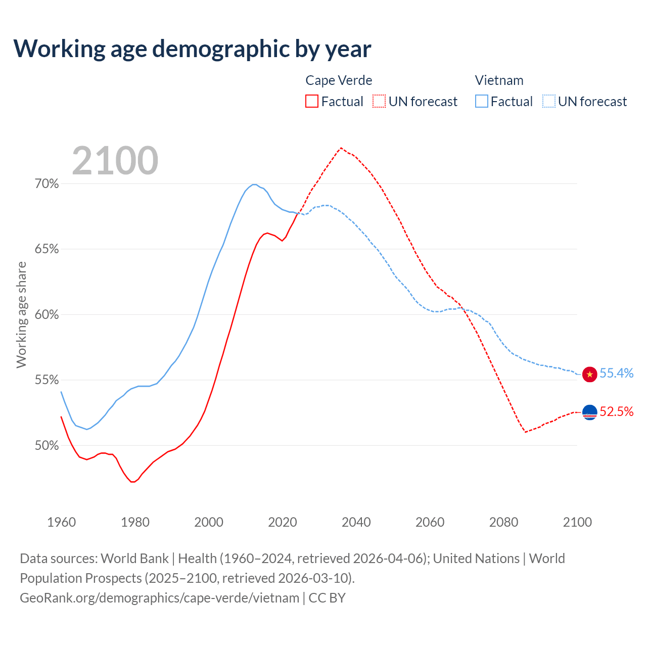 Median age Cape Verde vs Vietnam, 1960-2100