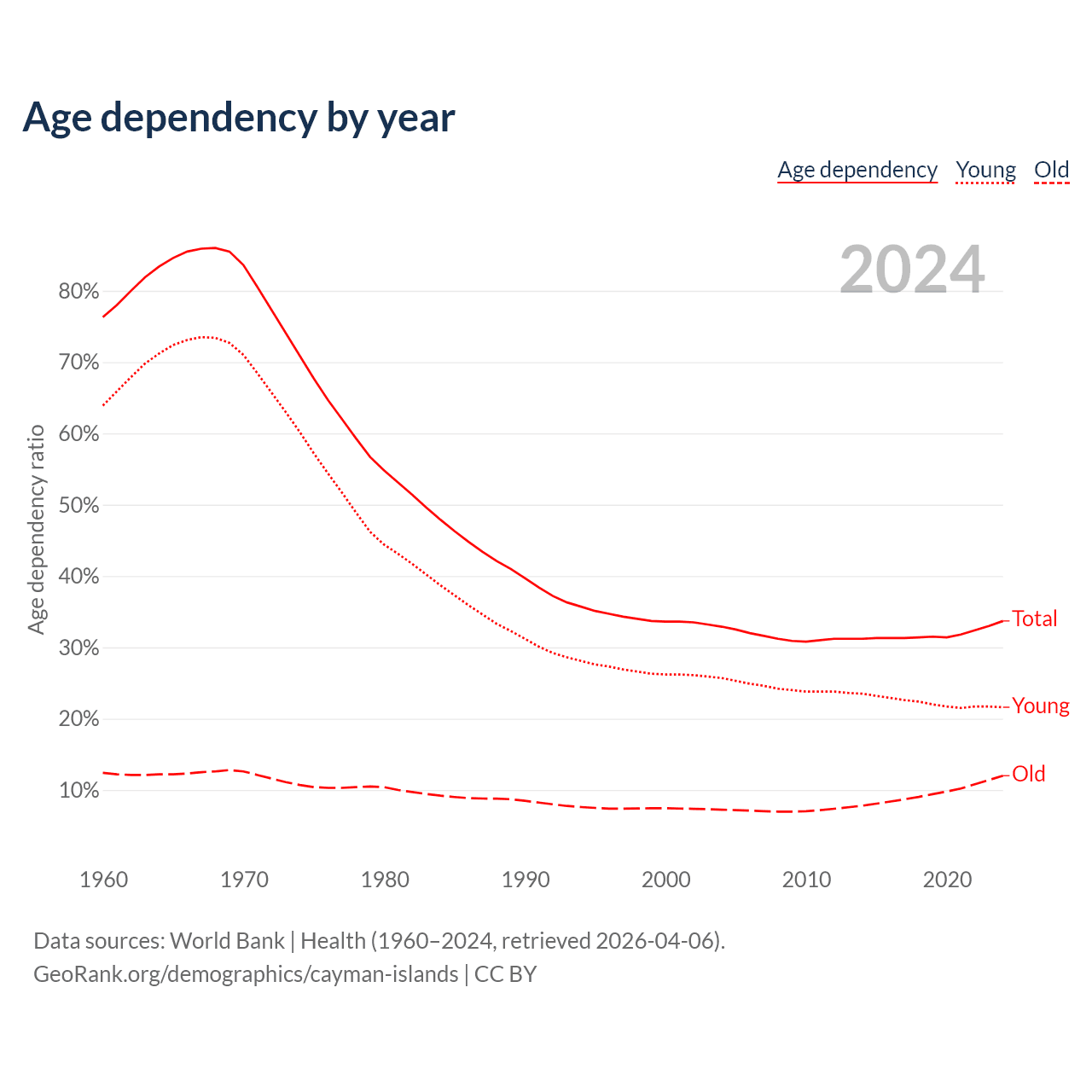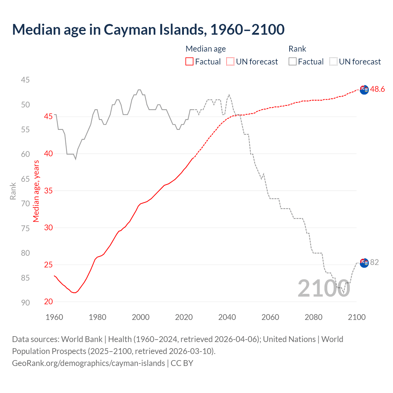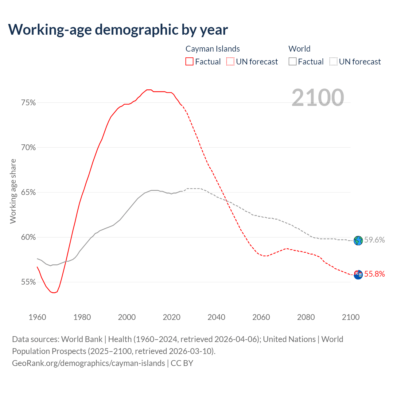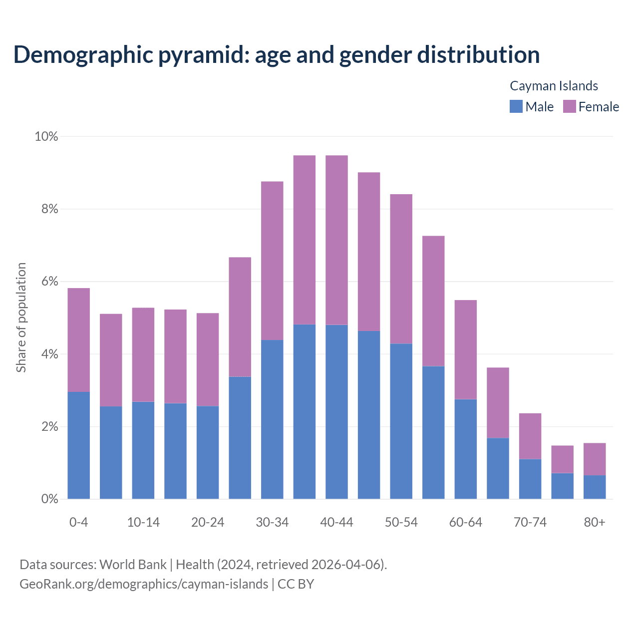 With a population of 74.5K people, the Cayman Islands has a median age of 39.3 years which makes it the 51/196 oldest country. 16.2% of the demographic are children 0-14 years old, 74.8% are working-age people aged 15-64, and 9% are older population aged 65+ years.