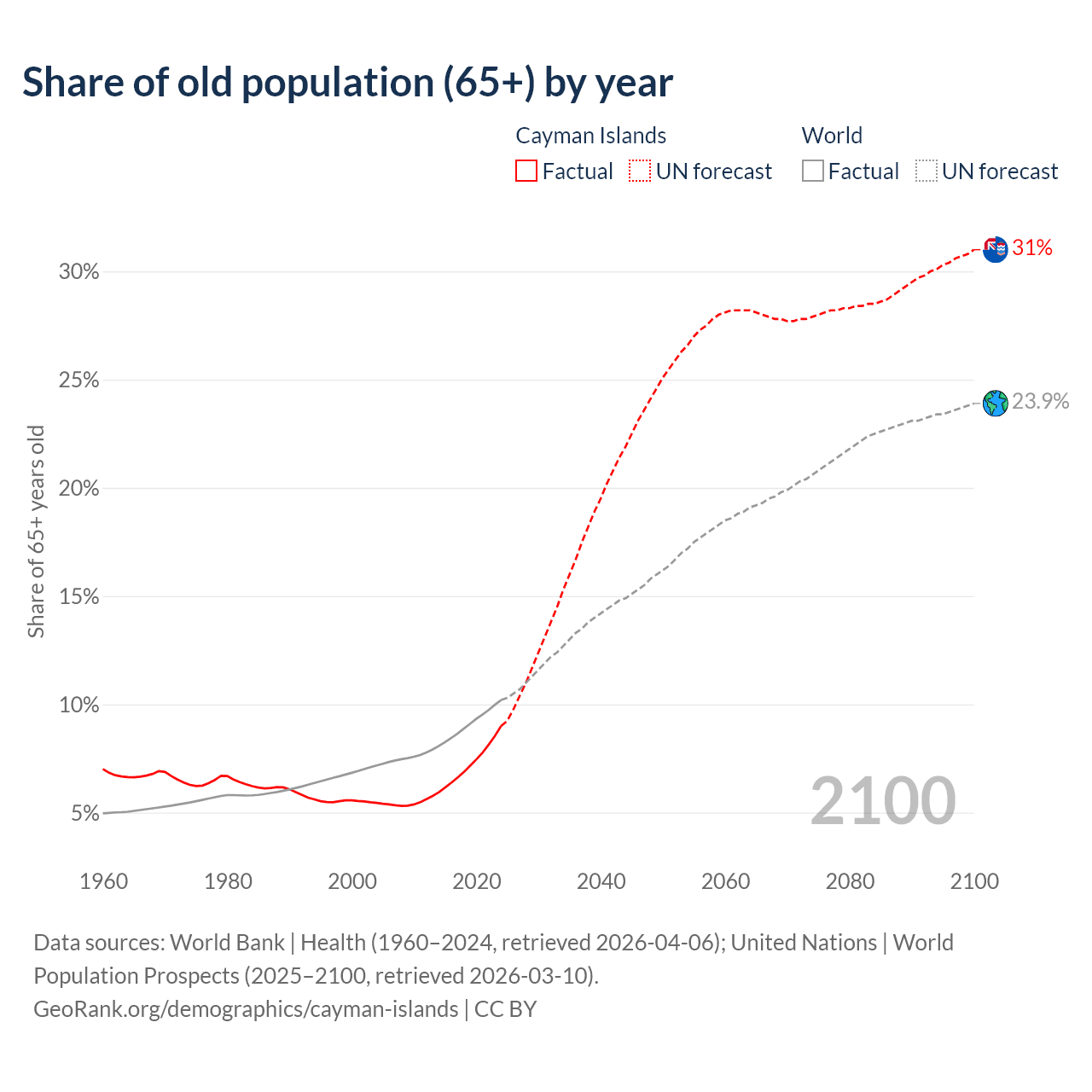 The share of older people aged 65 and over in the Cayman Islands increased from 5.45% to 9% between 2004 and 2024.