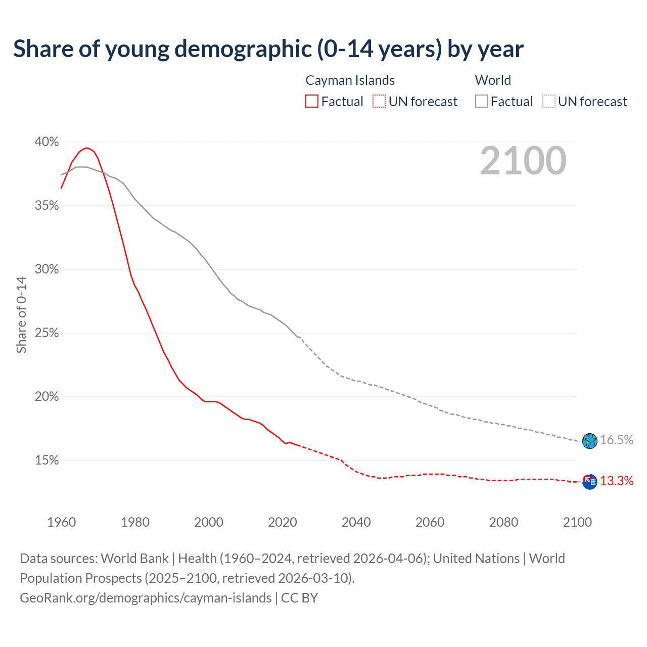 The share of children aged 0-14 in the Cayman Islands decreased from 19.3% to 16.2% between 2004 and 2024 due to changes in birth rates.