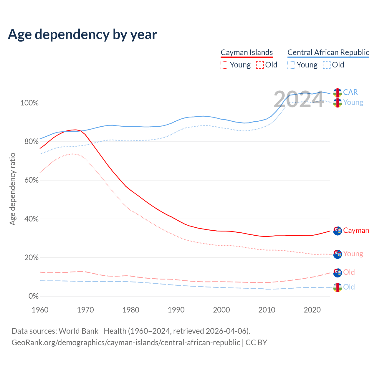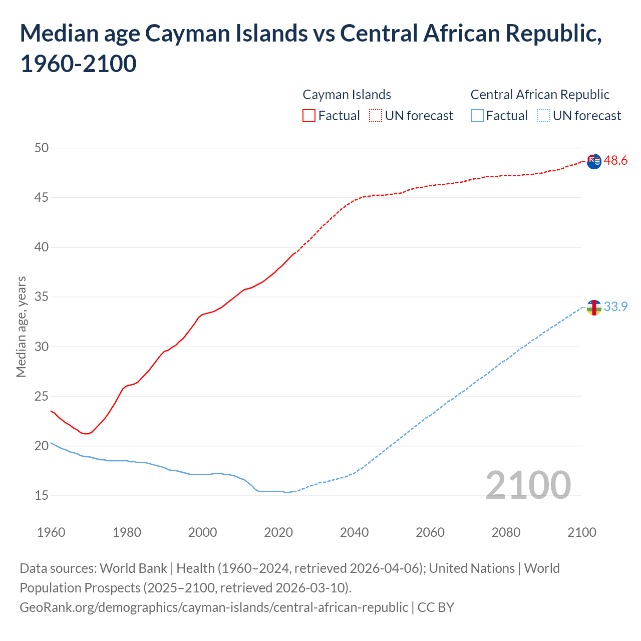- The Cayman Islands is ranked 51/196 by median age (oldest to youngest) vs 196/196 for the Central African Republic.