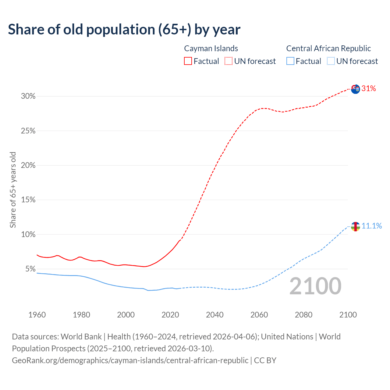 The share of older people aged 65 and over is 9% in the Cayman Islands and 2.15% in the Central African Republic. Life expectancy in the Cayman Islands compared to the Central African Republic .