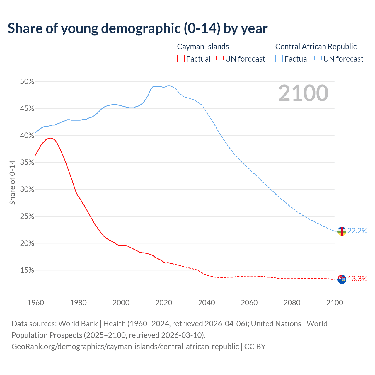 - The share of young demographic (0-15 years old) in the Cayman Islands is 16.2% vs 49% in the Central African Republic.