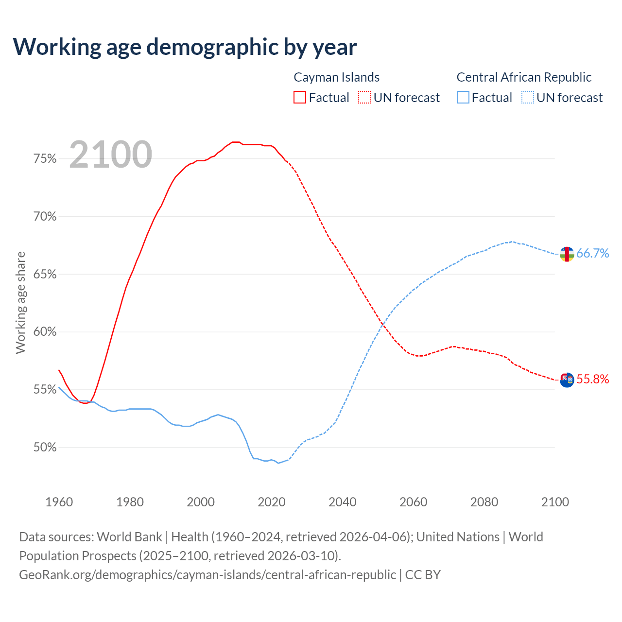 - The Cayman Islands has 58.1K working age adults (aged 15-64) vs 2.81M in the Central African Republic.
