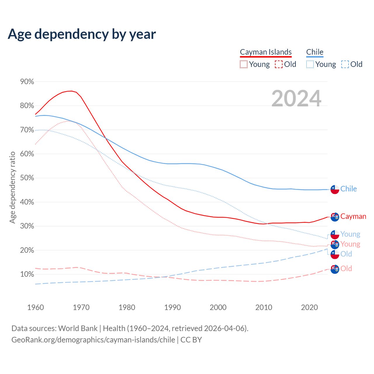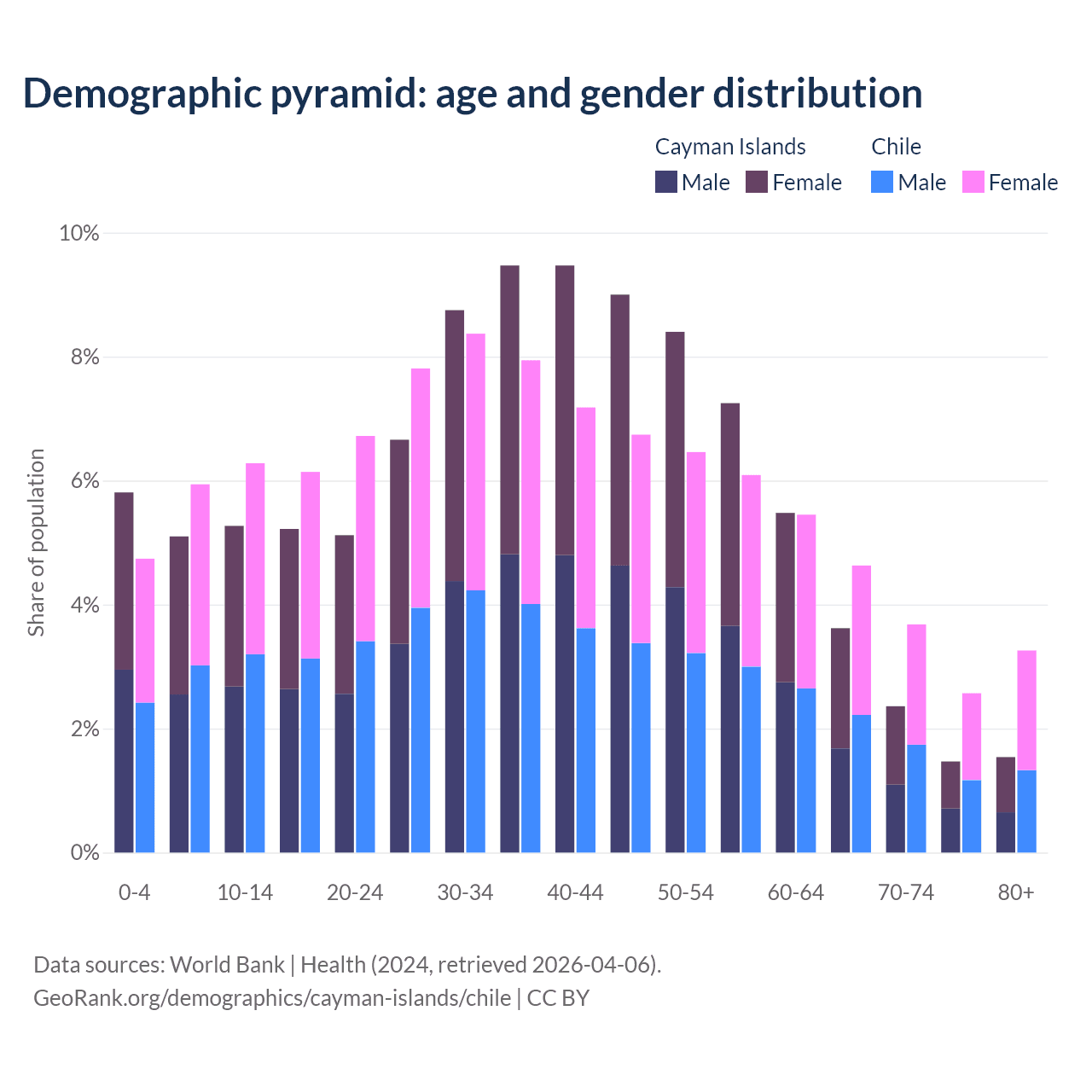 The share of older people aged 65 and over is 9% in the Cayman Islands and 14.1% in Chile. Life expectancy in the Cayman Islands compared to Chile .