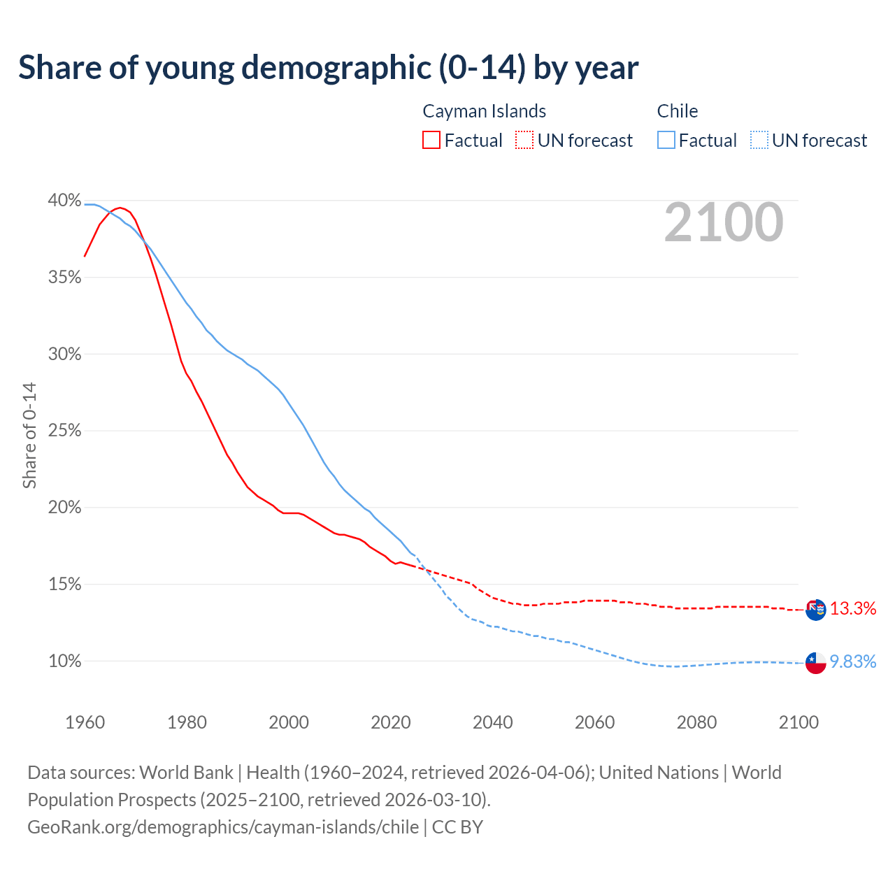 - The share of young demographic (0-15 years old) in the Cayman Islands is 16.2% vs 17% in Chile.