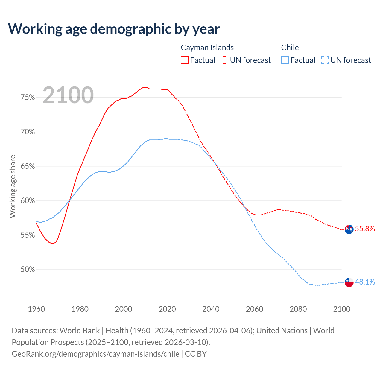 - The Cayman Islands has 58.1K working age adults (aged 15-64) vs 13.8M in Chile.