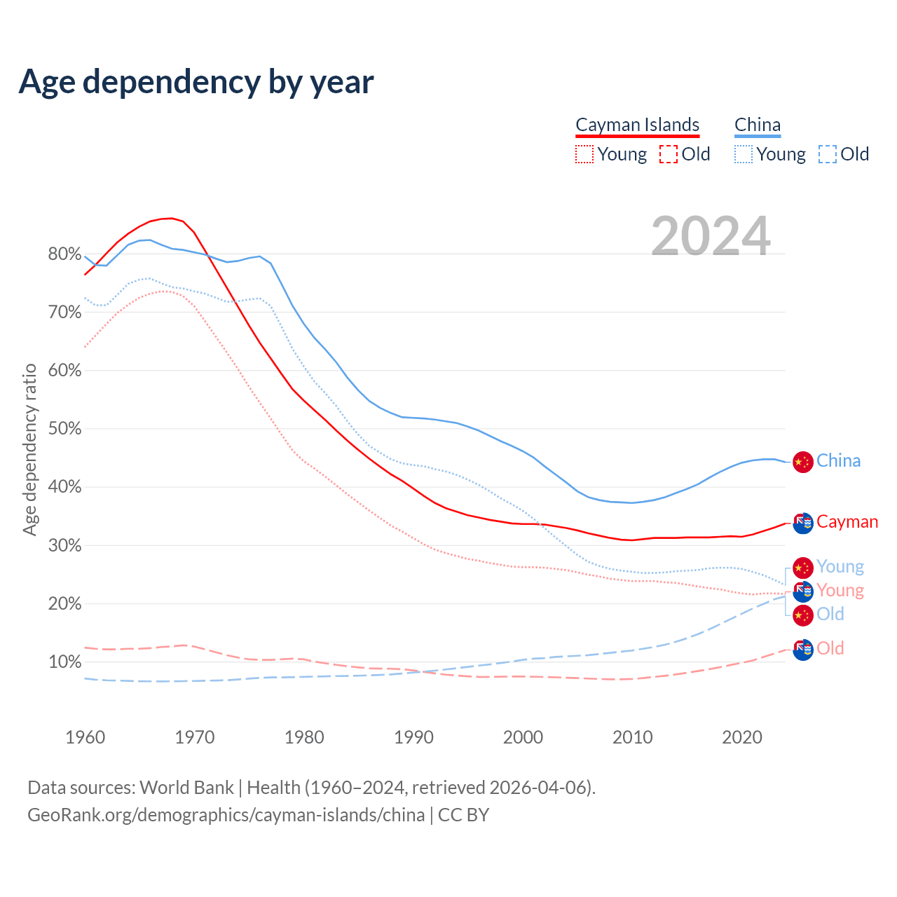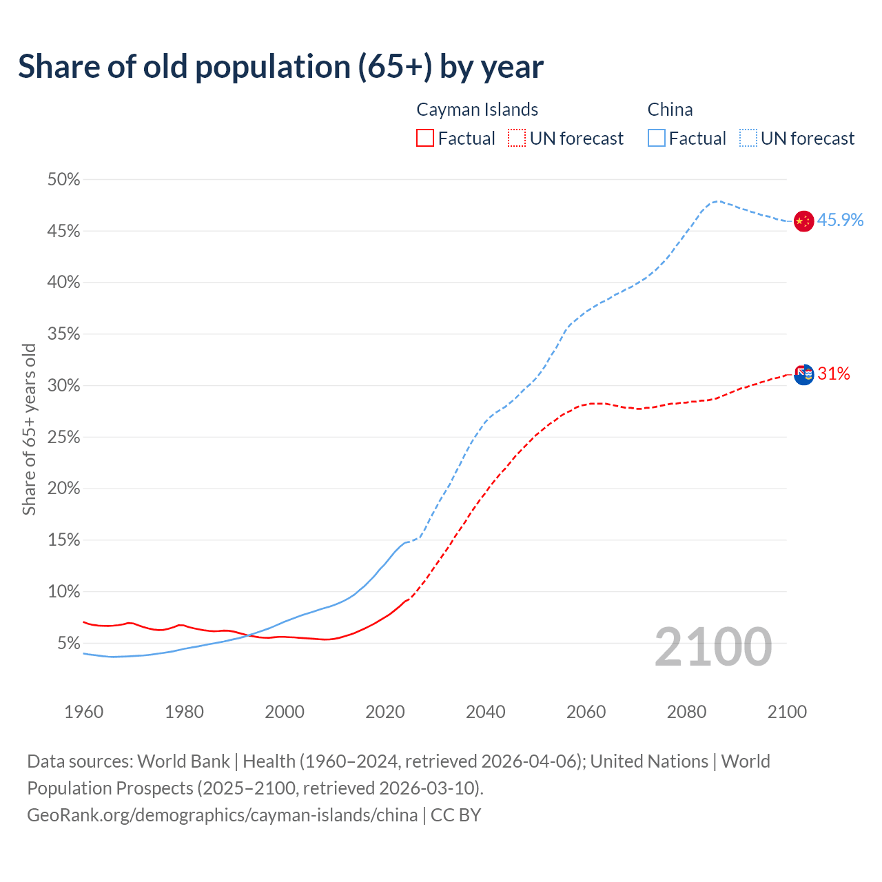 The share of older people aged 65 and over is 9% in the Cayman Islands and 14.7% in China. Life expectancy in the Cayman Islands compared to China .
