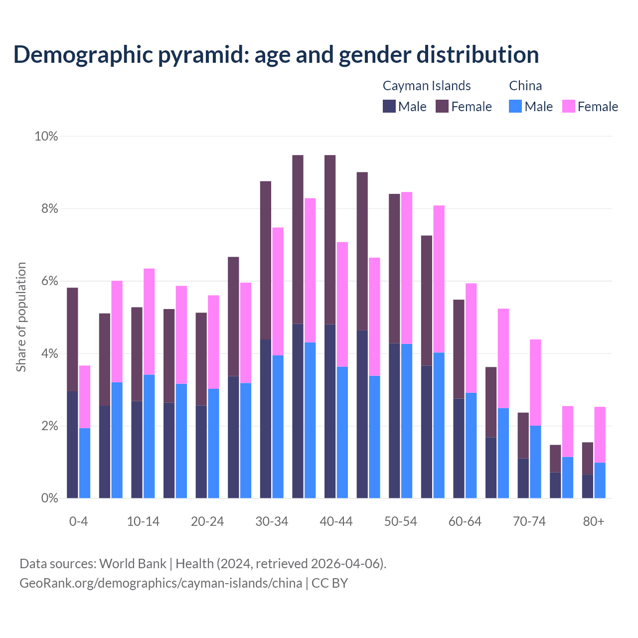 - The Cayman Islands is ranked 51/196 by median age (oldest to youngest) vs 44/196 for China.